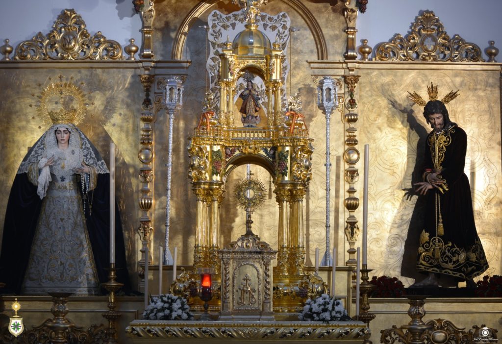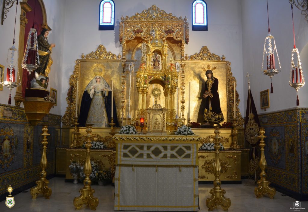 Con motivo de la celebración del triduo en honor al Santísimo Sacramento del Altar, primer titular de nuestra corporación, la custodia de asiento de Su Divina Majestad, ya ubicada sobre su paso procesional, preside la capilla de la hermandad en la Parroquia de San Gonzalo, hallándose por delante del retablo de nuestras imágenes, desplazándose a Nuestro Padre Jesús en Su Soberano Poder al lugar que habitualmente ocupa San Juan Evangelista, ya que en la parte central del tríptico se ha colocado el estandarte sacramental. Así mismo, la imagen del discípulo amado se halla en una esquina del altar mayor del templo, como ocurre en Semana Santa. El conjunto aún no está concluido, pues está a falta de la cera definitiva y de las flores, que con las altas temperaturas propias de estas fechas se pondrán entre la noche de este miércoles 8 y la mañana del jueves 9, al ser en la tarde de este último día citado cuando arranque el triduo solemne.