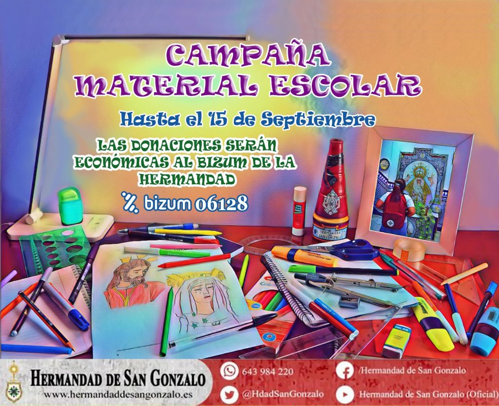 Nuestra Hermandad de San Gonzalo, a través de sus diputaciones de caridad y acción social, organiza otro año más, con motivo del inicio de un nuevo curso académico, su campaña para sufragar el material escolar de aquellos que precisen de esta ayuda. Este año, a diferencia de los anteriores, no se podrá donar material físico alguno, consistiendo únicamente en una recogida de donaciones económicas. La campaña ya ha dado comienzo como ofrenda simbólica a Nuestra Señora de la Salud con motivo de su besamano por su antigua festividad, y se extenderá hasta el próximo domingo 15 de septiembre.