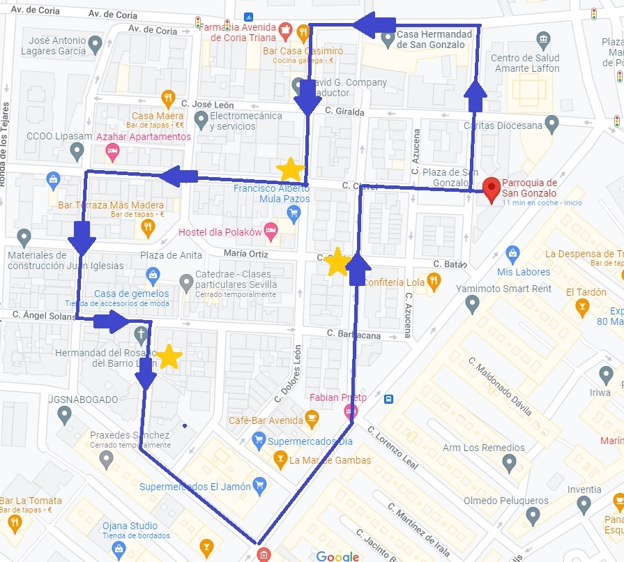 Itinerario: Salida en torno a las 9:45 horas, Nuestra Señora de la Salud, Avenida de Coria (Residencia Geriátrica Nuestra Señora de Consolación), Dolores León, Regla Sanz, José León Sanz, Ángel Solans, Padre Maruri, Francisco Collantes de Terán, Álvar Núñez, Cristo del Soberano Poder, Bienvenido Puelles Oliver, Plaza de San Gonzalo y entrada en torno a las 11:45 horas.