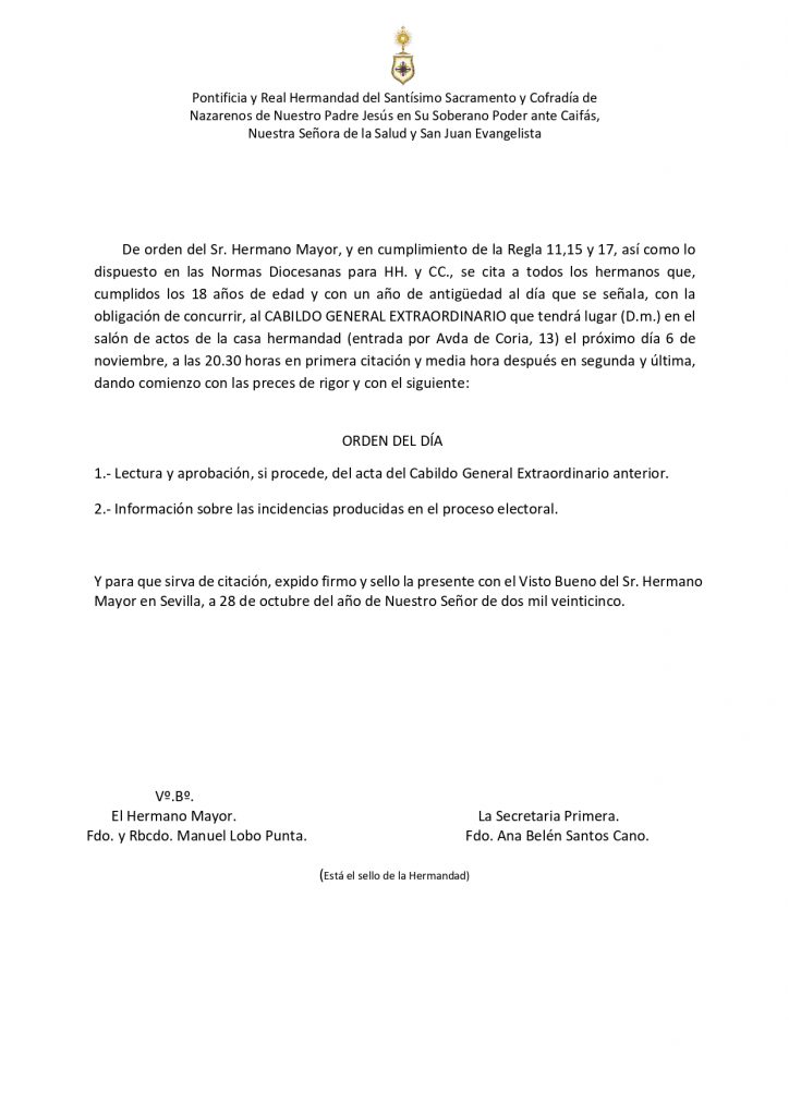 Convocatoria de Cabildo General Extraordinario Oct 28, 2025 AVISO: El cabildo se celebrará finalmente en la Iglesia de San Gonzalo