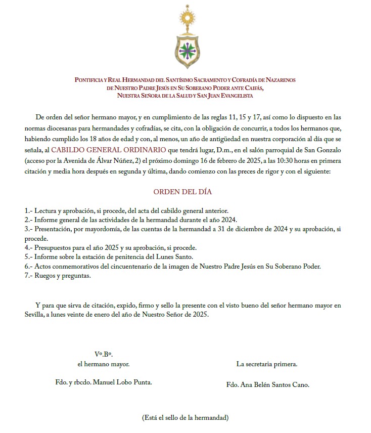 Cumpliendo con lo establecido en regla número 16 de nuestra hermandad, se comunica que para que todos los hermanos tengan debido conocimiento de los asuntos a tratar y hagan uso responsable de los derechos que les conceden nuestras reglas, desde el jueves 6 de febrero, y en horario de secretaría, estarán a su disposición, para ser examinados, los libros y documentos que afecten a los puntos del orden del día del cabildo general ordinario a celebrar el próximo domingo 16 de febrero de 2025.