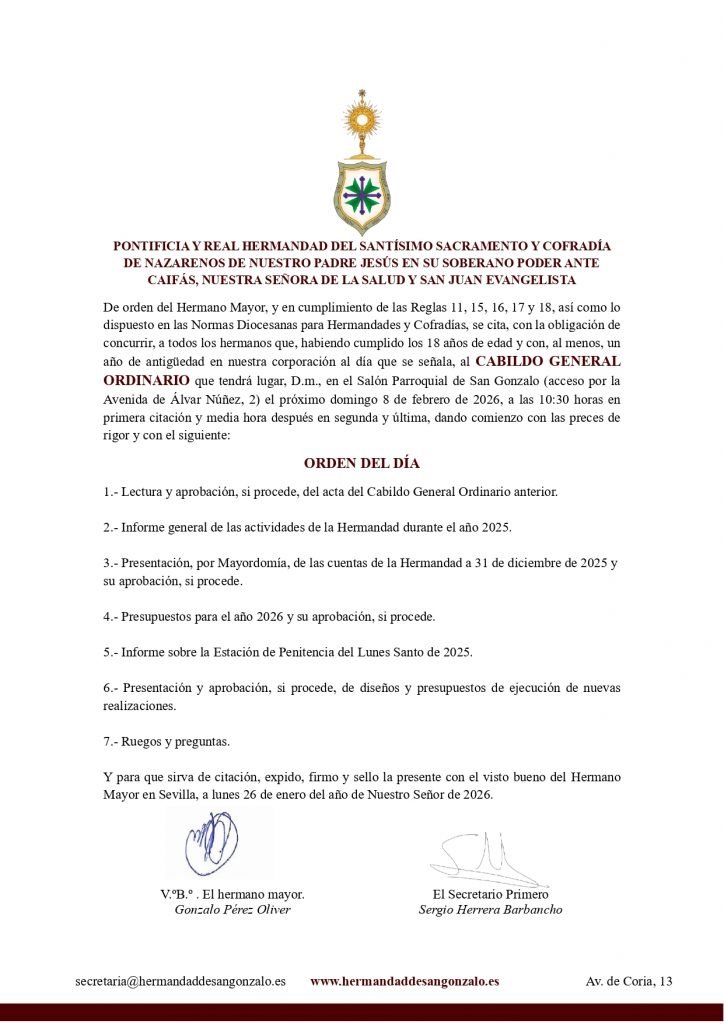 De orden del Hermano Mayor, y en cumplimiento de las Reglas 11, 15, 16, 17 y 18, así como lo dispuesto en las Normas Diocesanas para Hermandades y Cofradías, se cita, con la obligación de concurrir, a todos los hermanos que, habiendo cumplido los 18 años de edad y con, al menos, un año de antigüedad en nuestra corporación al día que se señala, al CABILDO GENERAL ORDINARIO que tendrá lugar, D.m., en el Salón Parroquial de San Gonzalo (acceso por la Avenida de Álvar Núñez, 2) el próximo domingo 8 de febrero de 2026, a las 10:30 horas en primera citación y media hora después en segunda y última, dando comienzo con las preces de rigor y con el siguiente: