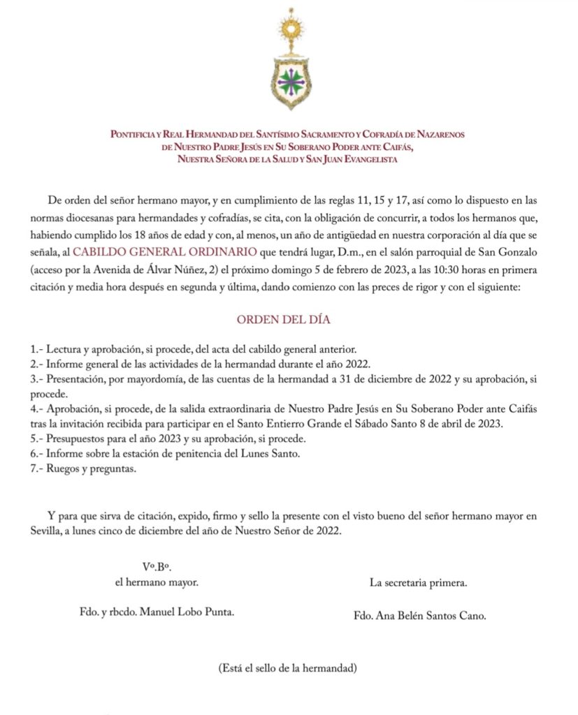 Cumpliendo con lo establecido en regla número 16 de nuestra hermandad, se comunica que para que todos los hermanos tengan debido conocimiento de los asuntos a tratar y hagan uso responsable de los derechos que les conceden nuestras reglas, a partir del jueves 26 de enero, y en horario de secretaría, estarán a su disposición, para ser examinados, los libros y documentos que afecten a los puntos del orden del día del cabildo general ordinario a celebrar el próximo domingo 5 de febrero de 2023.