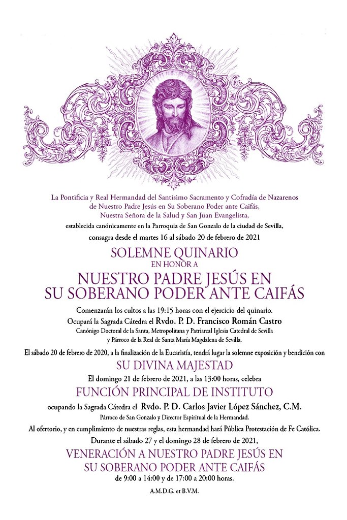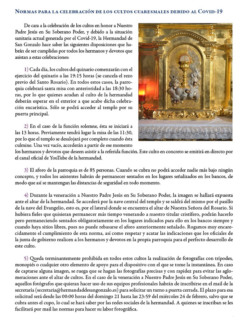 Cultos en honor a Nuestro Padre Jesús en Su Soberano Poder y normas para asistir a éstos en SanGonzalo debido a la situación sanitaria. Hay que matizar que el quinario comenzará a las 19:15 horas.