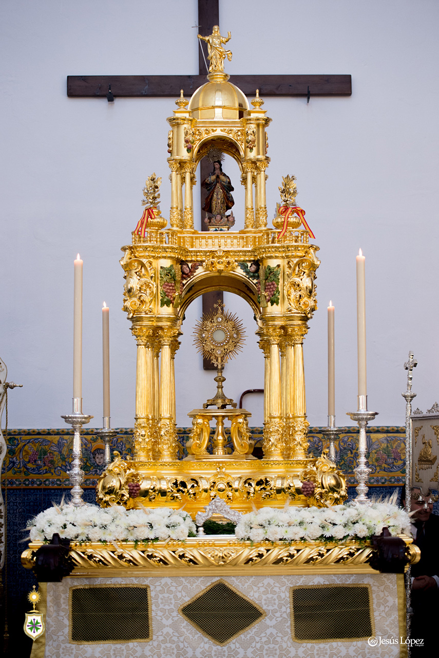 El paso de la Custodia Sacramental está tallado en madera de cedro real americano. De estilo barroco, con la canastilla de entrantes y salientes en planta y alzada, con esquinas lobuladas y cartelas en los centros frontales, laterales y traseras. Un primer cuerpo compuesto de doce columnas, colocadas de tres en tres en las extremos de la planta del conjunto, un cornisamento peraltado con cartelas en las esquinas y en los centros, que da lugar a arcadas, y en su parte interior un techo decorado. En la parte superior de este cornisamento, una balaustrada que lo recorre y cuatro jarras sobre peanas en las esquinas. Las columnas tienen capiteles corintios romanos, el fuste con el primer tercio tallados en adornos y los dos tercios restantes estriados. El segundo cuerpo es igual que el primero menos el lóbulo de las esquinas. La parte superior de este cuerpo consta de una cúpula peraltada, dividida por contrafuerte y rematada por una peana.