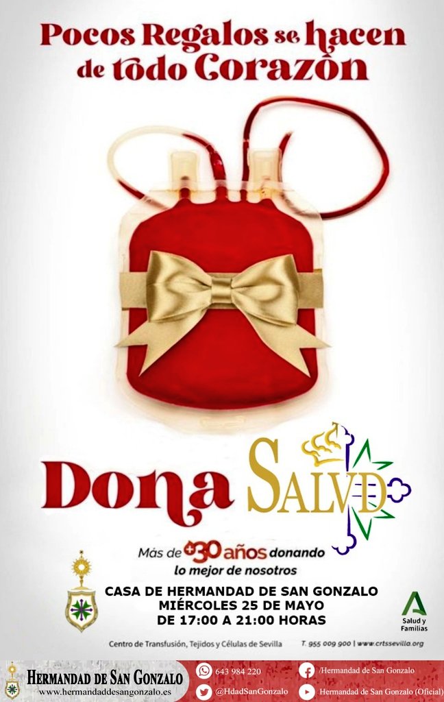 Las diputaciones de caridad y de acción social organizan este próximo miércoles 25 de mayo, junto al Centro de Transfusión Sanguínea de Sevilla, una donación de sangre en nuestra casa hermandad de San Gonzalo.