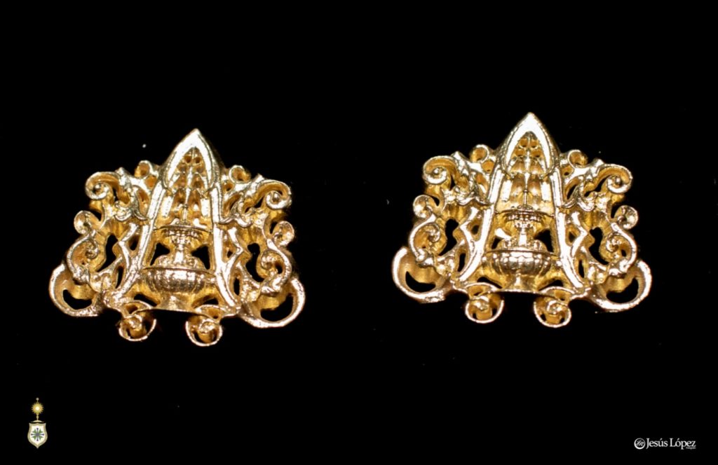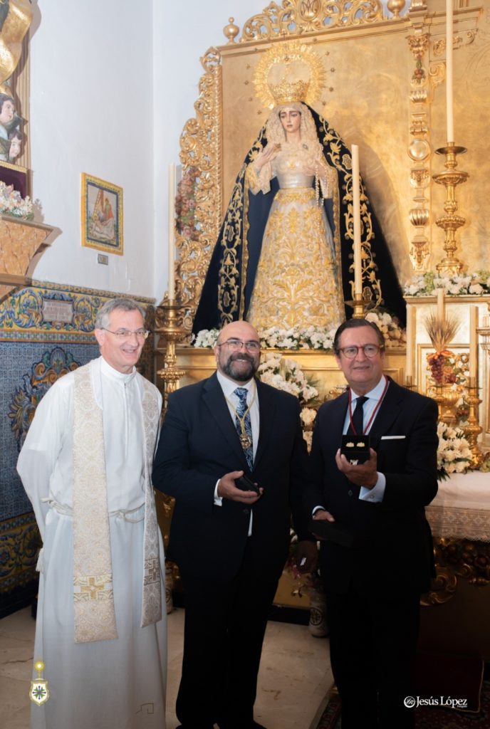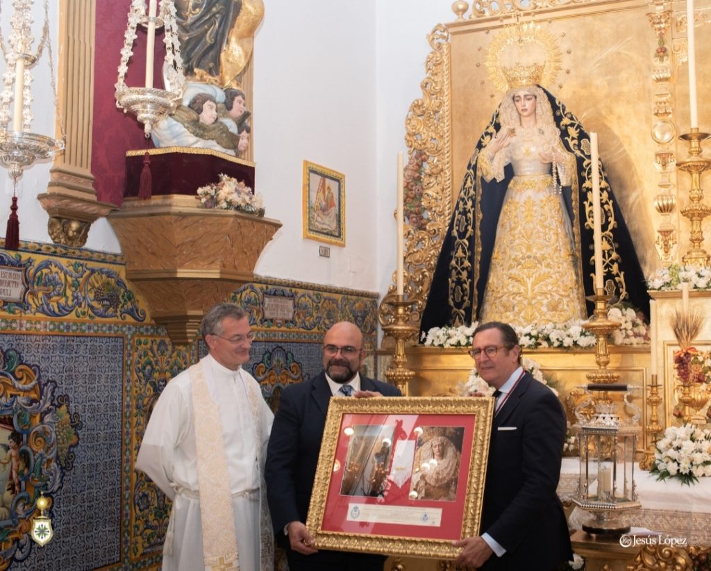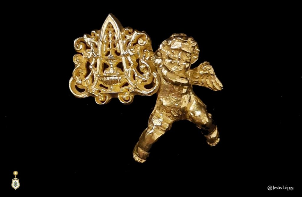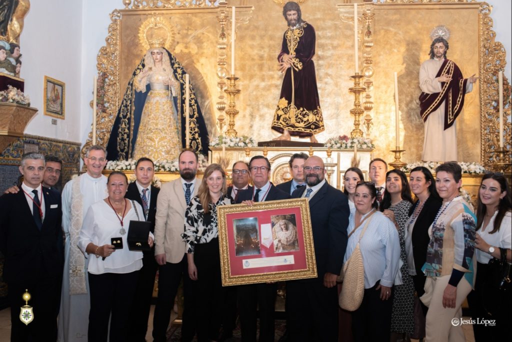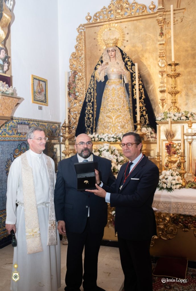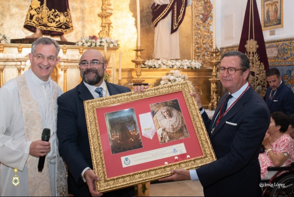 A la finalización de nuestro culto externo sacramental, ante el altar de nuestros amantísimos titulares, el hermano mayor del Prendimiento de Ciudad Real, Mariano Ureña, ha entregado al nuestro, Manuel Lobo, varios presentes. En primer lugar, un cuadro con un pañuelo enmarcado de su dolorosa y dos fotografías, una frontal y otra de espaldas, en las que luce el manto en cuestión. Y en segundo lugar, sendas piezas que vienen a enriquecer el ajuar de nuestras imágenes, consistentes en un broche para Nuestra Señora de la Salud -con un angelito que porta el escudo de esta cofradía castellano-manchega- y unos gemelos para Nuestro Padre Jesús en Su Soberano Poder -la heráldica corporativa de esta querida hermandad-.