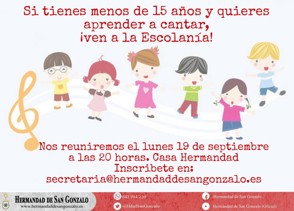 Todos aquellos hermanos que tengan menos de 15 años de edad y posean inquietudes para aprender a cantar, pueden participar en el proyecto de la nueva escolanía que se va a crear en nuestra Hermandad de San Gonzalo.