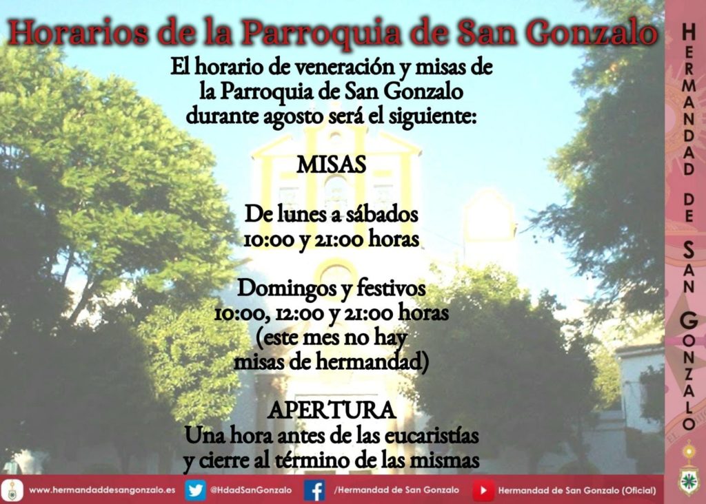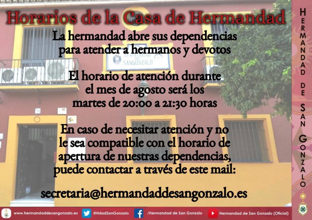 Información general de horarios y aperturas del templo y de la casa de hermandad a lo largo del mes de agosto de 2021. Ago 1, 2021