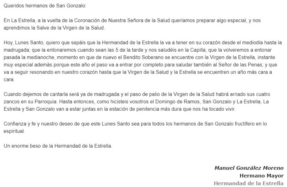 Nuestro hermano mayor, José Fernández, dirigió ayer unas palabras a nuestra querida Hermandad de la Estrella en estos duros momentos. Hoy es Manuel Moreno, el hermano mayor de nuestra corporación madrina, quien con todo su cariño le habla a los hermanos de San Gonzalo.