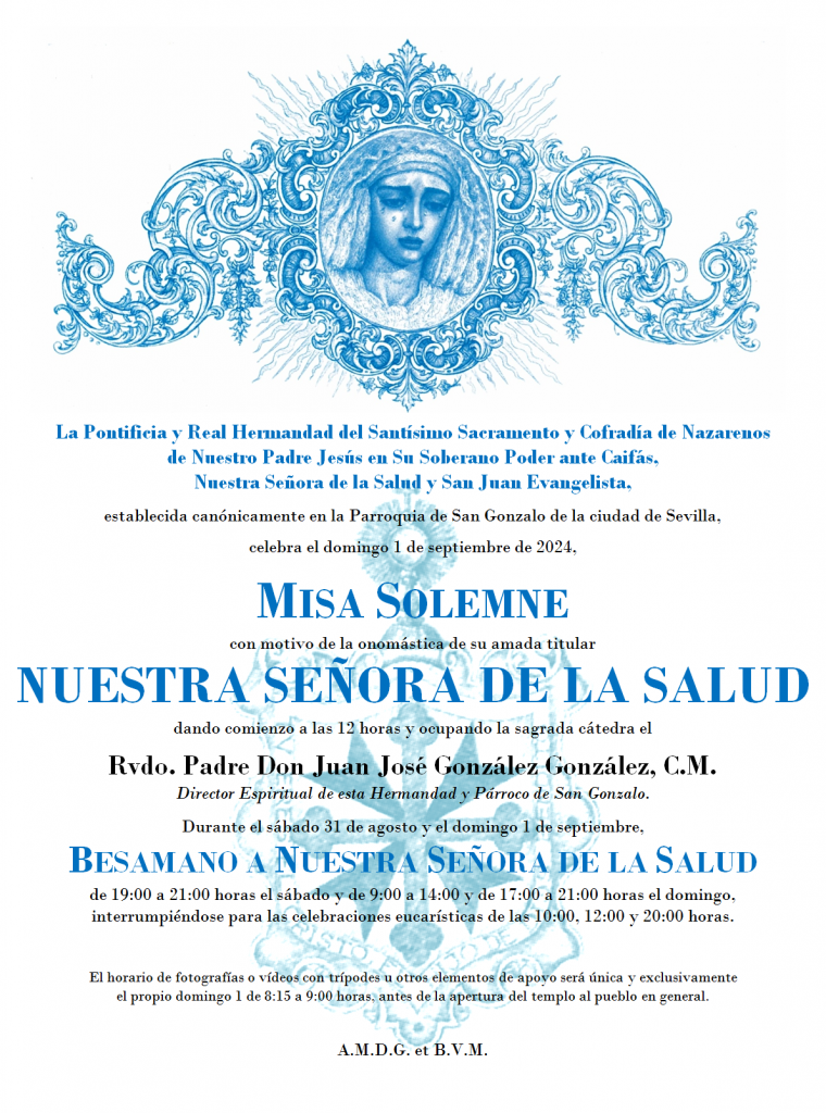El próximo domingo 1 de septiembre de 2024, a las 12 horas, tendrá lugar la misa solemne en honor a Nuestra Señora de la Salud. El besamano comenzará el sábado 31 de agosto a las 19 horas para concluir a las 21, y continuará el referido domingo de 9 a 14 y de 17 a 21 horas, respetándose el horario de misas de la Parroquia de San Gonzalo, que serán, además de la nuestra de las 12, a las 10 y a las 20 horas.