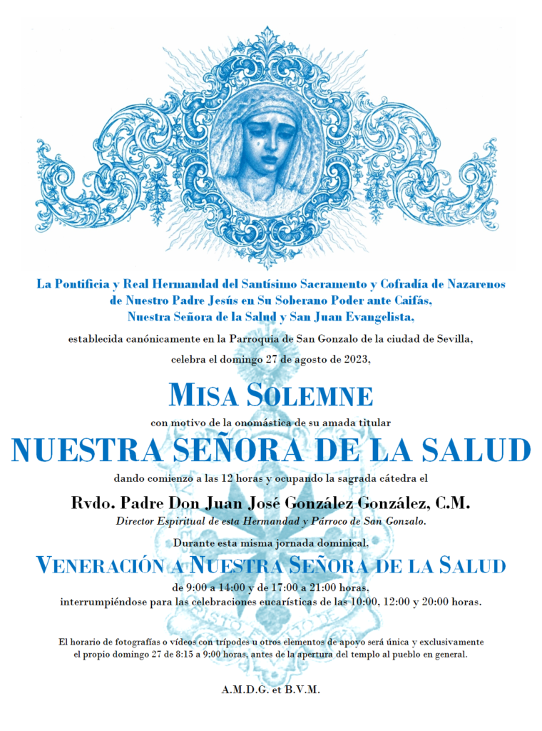 El próximo domingo 27 de agosto de 2023, a las 12 horas, tendrá lugar la misa solemne en honor a Nuestra Señora de la Salud. El acto de veneración será de 9 a 14 y de 17 a 21 horas, respetándose el horario de misas de la Parroquia de San Gonzalo, que serán, además de la nuestra de las 12, a las 10 y a las 20 horas.