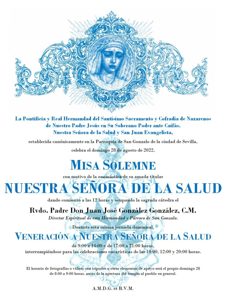 El próximo domingo 28 de agosto de 2022, a las 12 horas, tendrá lugar la misa solemne en honor a Nuestra Señora de la Salud. El acto de veneración será de 9 a 14 y de 17 a 21 horas, respetándose el horario de misas de la Parroquia de San Gonzalo, que serán, además de la nuestra de las 12, a las 10 y a las 20 horas.