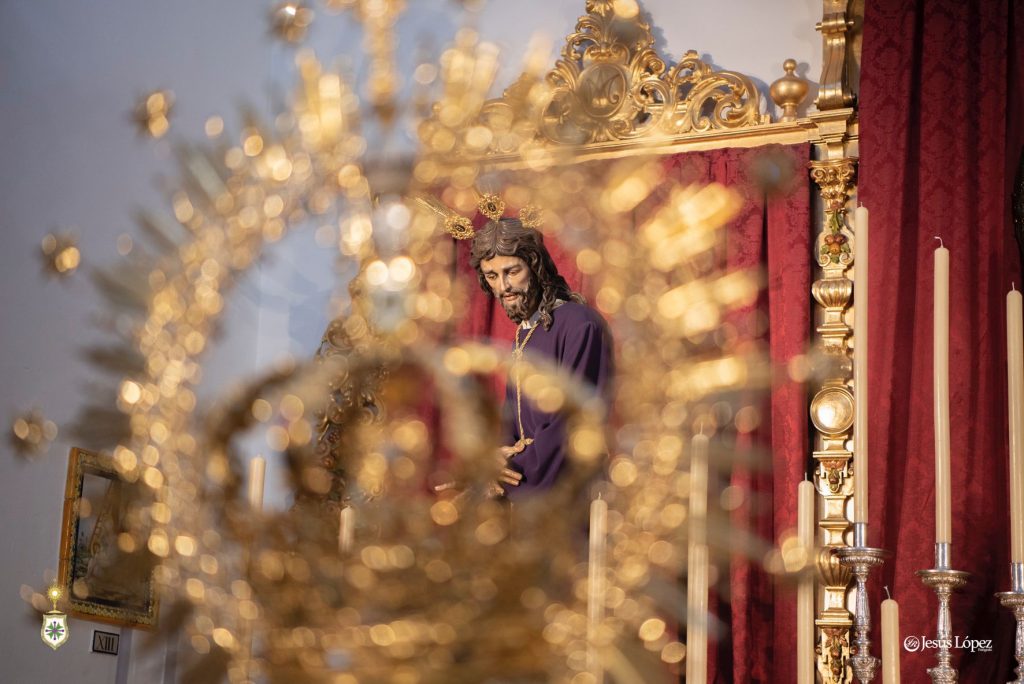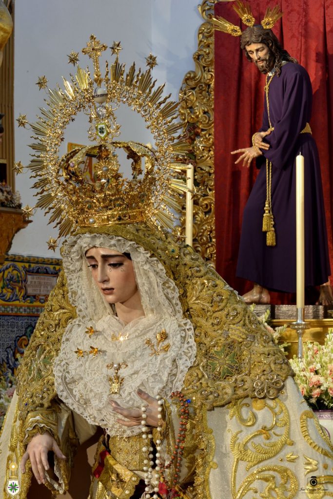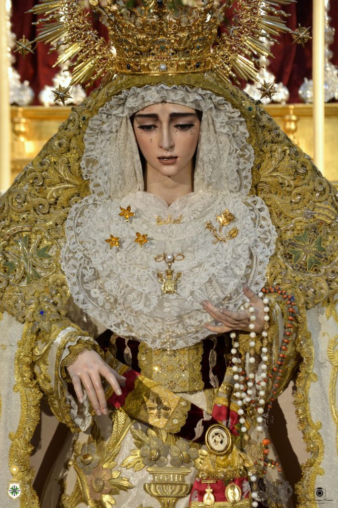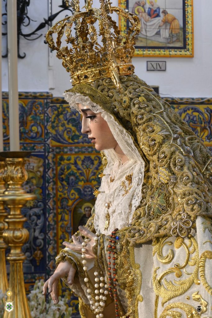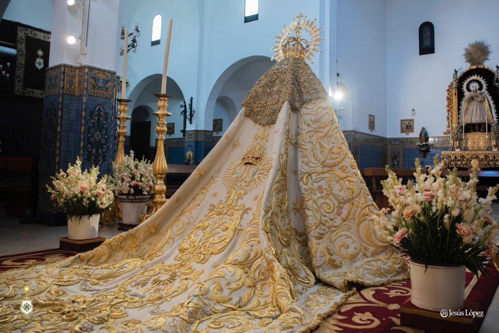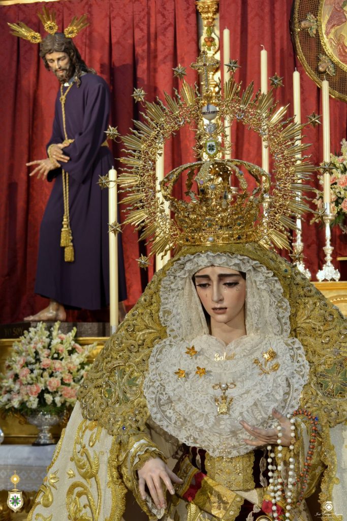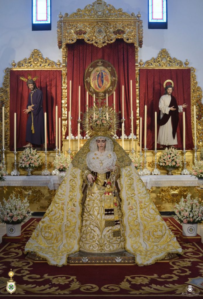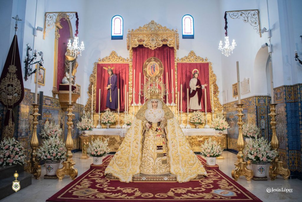 El exorno floral consiste en nardos y claveles bicolor (crema y rosa). Ante el altar cuelgan lámparas de cristal de nuestro patrimonio, y Nuestra Señora de la Salud se ubica sobre la alfombra elaborada por Baldomero, de Castilleja de la Cuesta, en 2022.