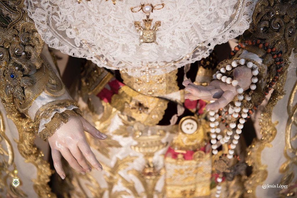 La Santísima Virgen, revestida por Antonio Bejarano Ruiz, luce la saya bordada en 1997 en el taller de Fernández y Enríquez con diseño de Manuel Guzmán Bejarano, la toca de sobremanto confeccionada y diseñada por Antonio Garduño Navas en 1975, y el manto de salida ejecutado por Jesús Rosado Borja y dibujado por Francisco Javier Sánchez de los Reyes en 2023. Sobre sus sienes, la Señora porta la presea labrada en plata por Fernando Marmolejo Camargo en 1967 y remozada y enriquecida en 2017 con oro y piedras preciosas por su hijo, Fernando Marmolejo Hernández, para la coronación canónica. A la cintura se anuda un fajín bordado por Gonzalo Cuevas en el Taller de Los Ángeles y ha sido regalado por un hermano, por lo que se está estrenando esta pieza. Entre las joyas cabe destacar la medalla de oro de la Asociación de la Medalla Milagrosa de nuestra parroquia, los broches de la Asociación de Fieles de Nuestra Señora de los Reyes y de la Hermandad de la Paz (este último en memoria de su hermano mayor, Manuel Recio Gallardo, recientemente fallecido), así como los azahares donados por el cuerpo de acólitos en el momento de la coronación de la Santísima Virgen, entre otras piezas. Y en el centro del pecho, la réplica de la Medalla de la Ciudad de Sevilla.