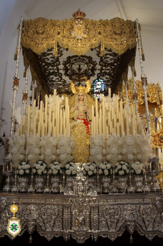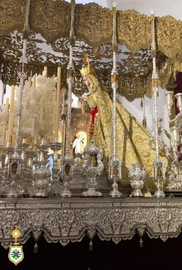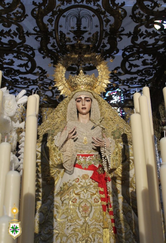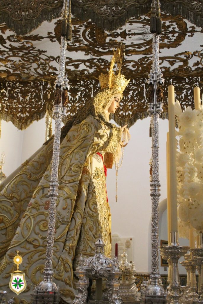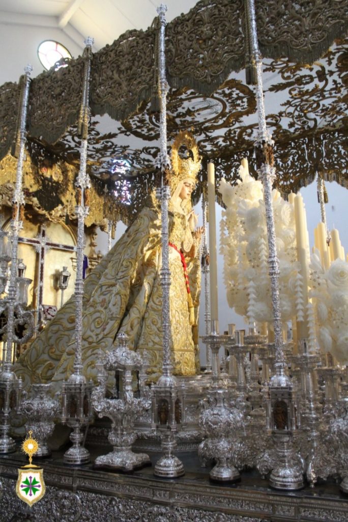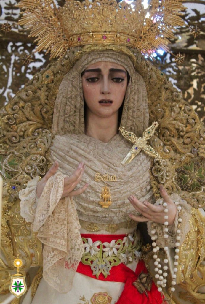Nuestra Señora de la Salud ya preside su paso de palio desde este sábado 25 de marzo, festividad de su Encarnación. Revestida por Antonio Bejarano Ruiz, nuestra titular mariana luce la saya estrenada el 14 de octubre de 2017 con motivo de su coronación canónica, obra bordada en el taller de Jesús Rosado Borja con diseño de Francisco Javier Sánchez de los Reyes, los mismos artistas que intervienen con idénticos cometidos en el manto de salida que la Santísima Virgen luce por vez primera y que estrenará este venidero Lunes Santo. Así mismo, cubre sus sienes la toca de sobremanto confeccionada y diseñada por Antonio Garduño Navas en 1975. En próximos días, la Señora portará, así mismo, el ajuar de joyería y orfebrería que lucirá en la estación de penitencia.