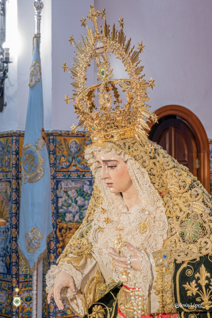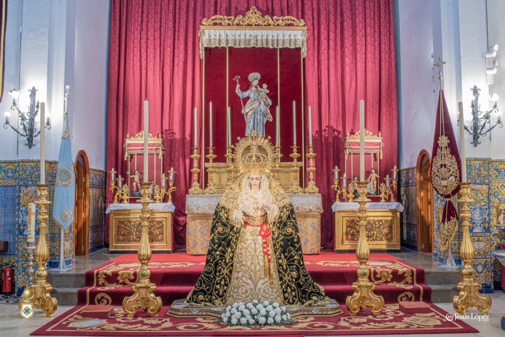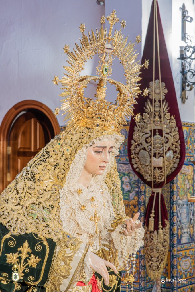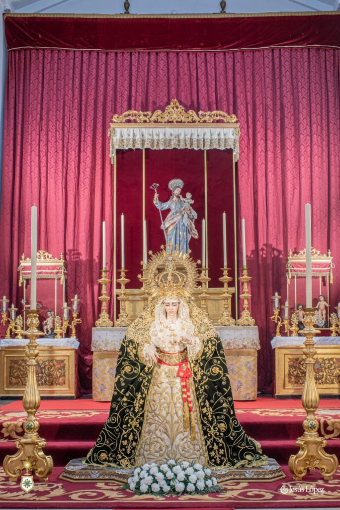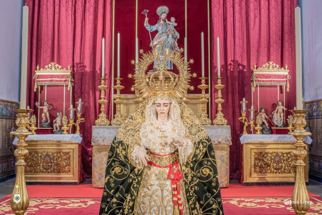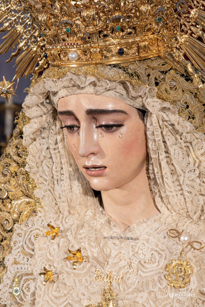 En la tarde del sábado 26 de agosto, antigua festividad de Nuestra Señora de la Salud según sus primitivas reglas, nuestra amada titular mariana aparece presidiendo el presbiterio de la Parroquia de San Gonzalo con motivo de su misa solemne y besamano, que tendrán lugar en la jornada de este domingo 27, último del presente mes como es costumbre. La Santísima Virgen, revestida por Antonio Bejarano, luce la saya bordada en 1997 en el taller de Fernández y Enríquez con diseño de Manuel Guzmán Bejarano y el manto verde ejecutado por José Librero Fernández en 2019 y dibujado por Maravillas Fernández. La toca de sobremanto es la de salida, obra de José Guillermo Carrasquilla en 1975 con diseño de Antonio Garduño Navas, entonces hermano mayor de nuestra corporación. Sobre sus sienes, la Señora porta la presea labrada en plata por Fernando Marmolejo Camargo en 1967 y remozada y enriquecida en 2017 con oro y piedras preciosas por su hijo, Fernando Marmolejo Hernández, para la coronación canónica.