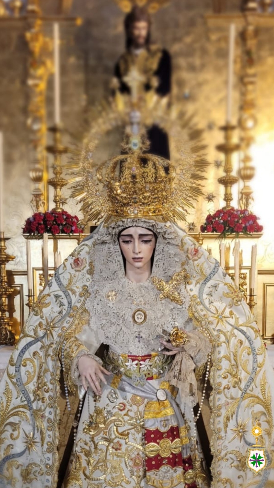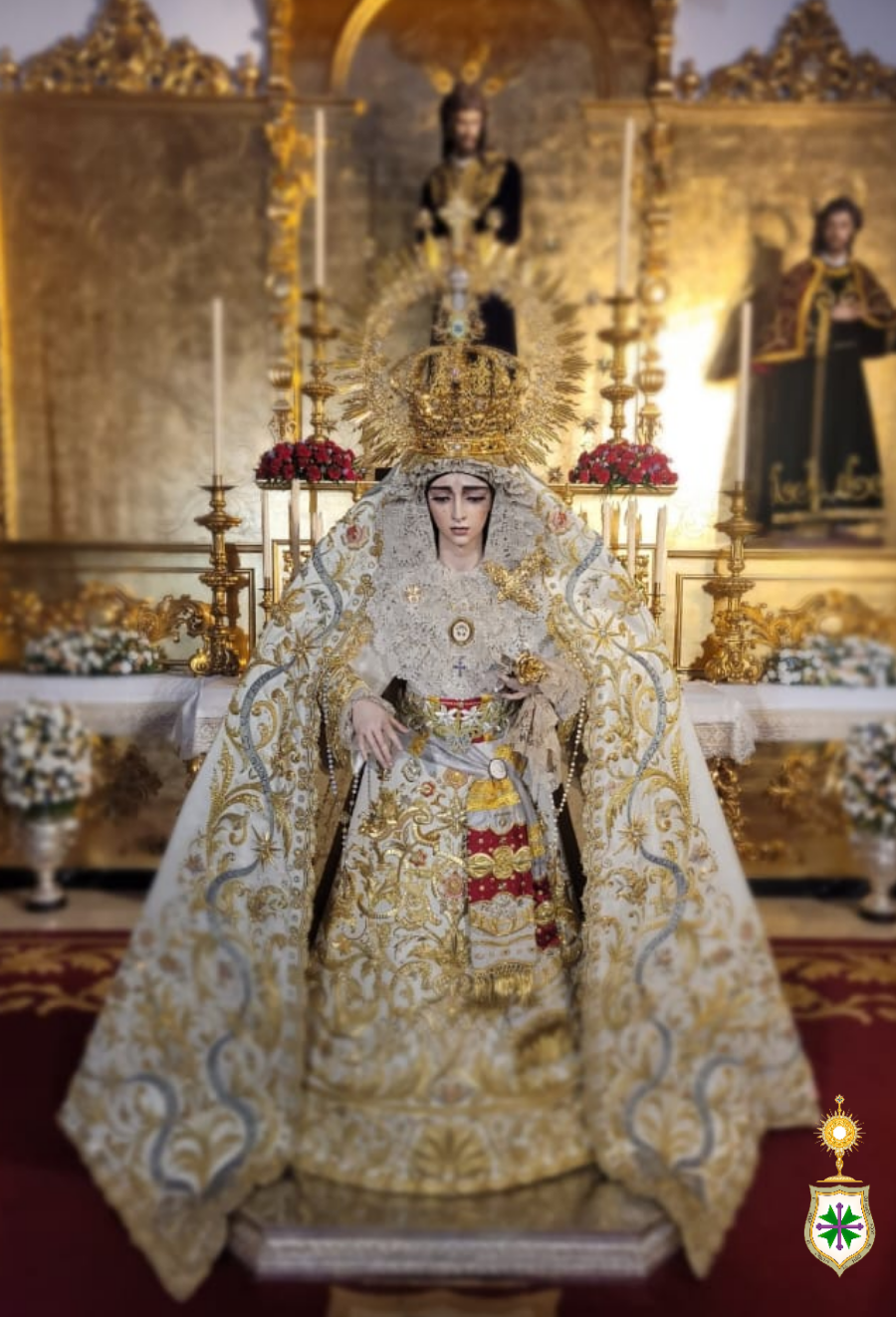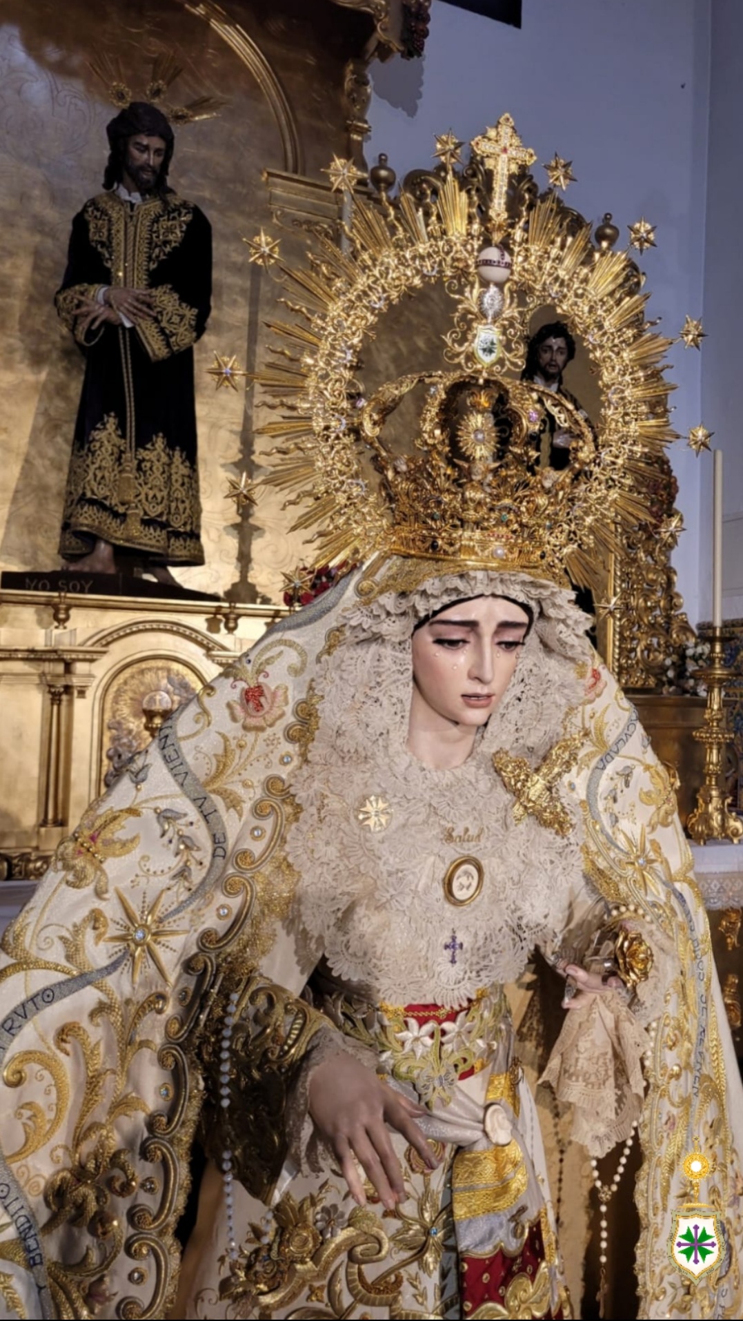 Nuestra Señora de la Salud ya se halla revestida por Antonio Bejarano Ruiz para su besamano de este fin de semana, si bien el aparato de culto que levantará durante la noche de este viernes. La Santísima Virgen luce el terno de la coronación canónica, esto es, saya de Jesús Rosado Borja y manto de Luis Miguel Garduño Lara con diseños, ambas piezas, de Francisco Javier Sánchez de los Reyes. Sobre sus sienes, porta la presea de Fernando Marmolejo Camargo labrada en 1967 y remozada para la coronación por su hijo Fernando Marmolejo Hernández en 2017. Como curiosidad, luce, entre otros, el camafeo de la Hermandad del Cachorro por las efemérides que conmemora esta corporación trianera y el rosario de la Hermandad de los Gitanos ante la próxima salida de María Santísima de las Angustias con motivo del I Congreso Nacional de Hermandades de los Gitanos.