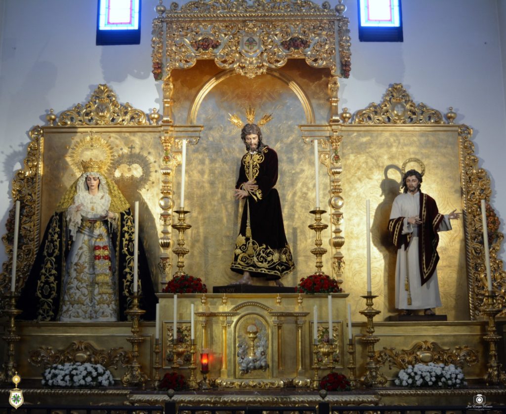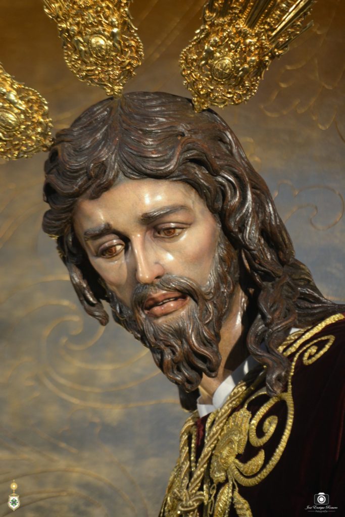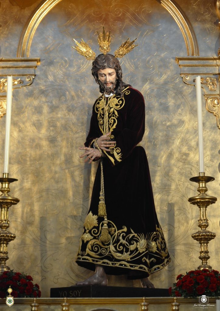 Durante este tiempo eucarístico, nuestro titular cristífero portará la túnica burdeos bordada en oro por José Librero Fernández en su taller de Coria del Río, y que fue estrenada en diciembre de 2019 con motivo de la reposición al culto de la efigie del Señor tras la última intervención que le practicó el conservador Pedro Manzano Beltrán.