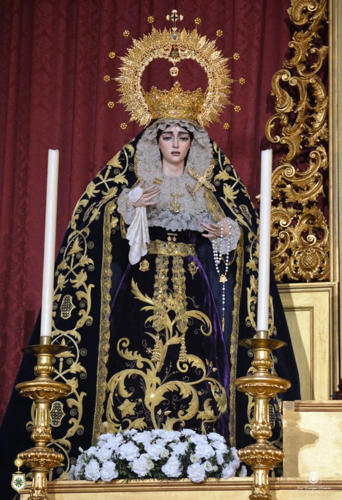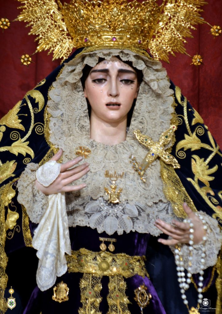 En la cintura, porta la Santísima Virgen la medalla en oro de su coronación obra de Fernando Marmolejo también en 2017, además de otros presentes realizados con motivo de aquella efemérides, como son los que regalaron las hermandades del Rosario de Mairena del Aljarafe y del Baratillo, este último como guiño por la próxima coronación de Nuestra Señora de la Piedad en el venidero mes de septiembre. Y sobre sus sienes, la Virgen ostenta la presea labrada en 2018 por Fernando Marmolejo Hernández, recuperando la ráfaga original creada por su padre para la primitiva corona del año 1967, que fue remozada para la coronación.
