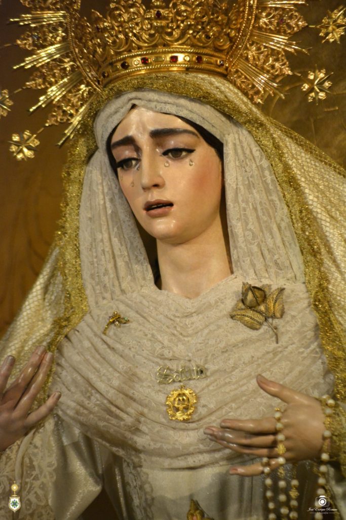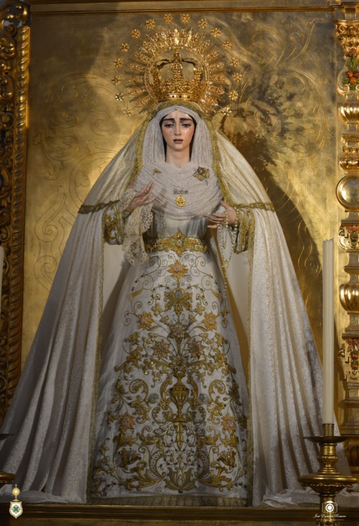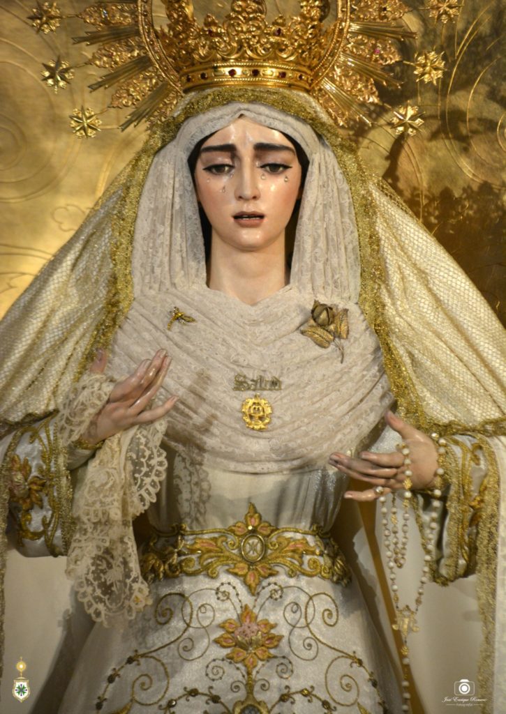 Nuestra Señora de la Salud, revestida por Antonio Bejarano Ruiz, porta la saya blanca bordada en el taller de Luis Miguel Garduño en 1999 y que combina técnica de aplicación con la del bordado en oro, luciendo también un manto de damasco perfilado con una concha dorada, y sobre esta prenda, una toca de sobremanto de malla con un encaje de concha de oro. Sobre sus sienes ostenta la corona de camarín que fue adquirida a la Hermandad de la Estrella en 1955 y que usó en la estación de penitencia hasta 1966, y que nuestra dolorosa no lucía en su altar desde el año 2018, rindiéndose con esta recuperación un homenaje a nuestra corporación madrina en este año en el que conmemora las bodas de plata de la coronación canónica de su titular mariana. En el pecho luce, a modo de broche, la fuente de la Salud que pende de la corona de camarín obra de Marmolejo Camargo y de Marmolejo Hernández. Por último, en su mano derecha lleva un pañuelo de encaje de Bruselas.