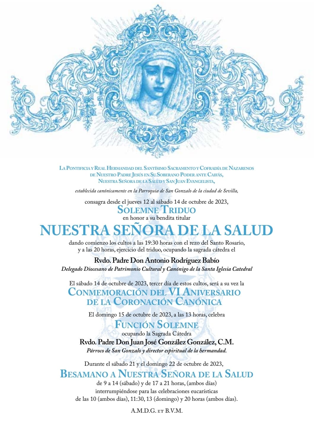 Este próximo jueves 12 de octubre dará comienzo el solemne triduo en honor a Nuestra Señora de la Salud, en cuyo tercer día, el sábado 14, se conmemorará el VI aniversario de la coronación canónica. Desde este lunes 9 por la noche, por cierto, nuestra amada titular preside el altar mayor de nuestra Parroquia de San Gonzalo, a la espera de que el equipo de priostía concluya en horas venideras el montaje del aparato de cultos con la candelería, la cera y el exorno floral.
