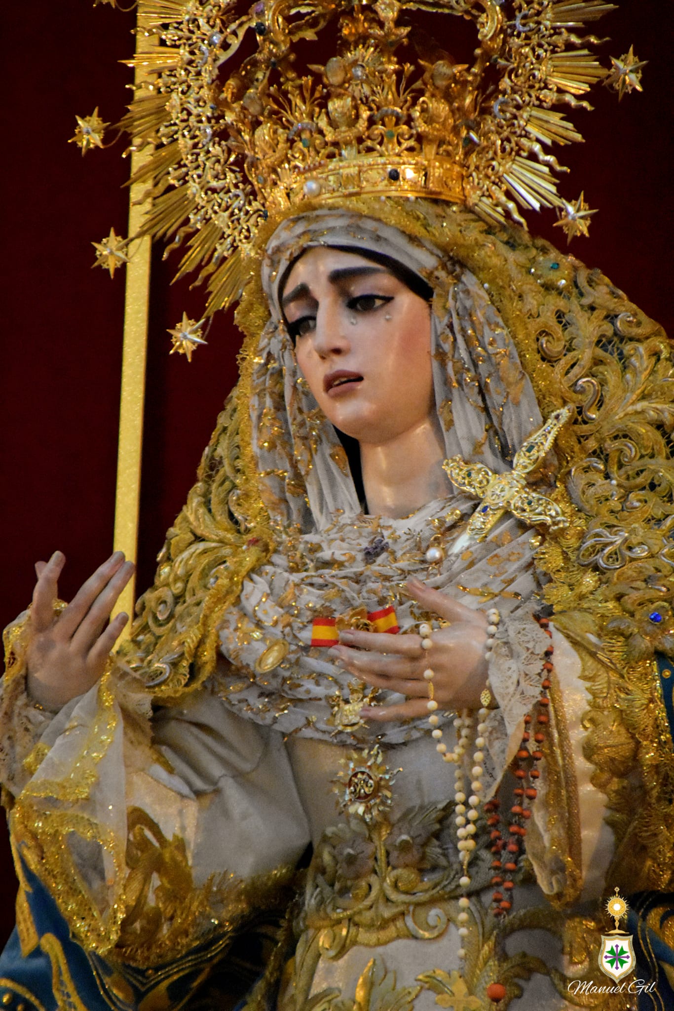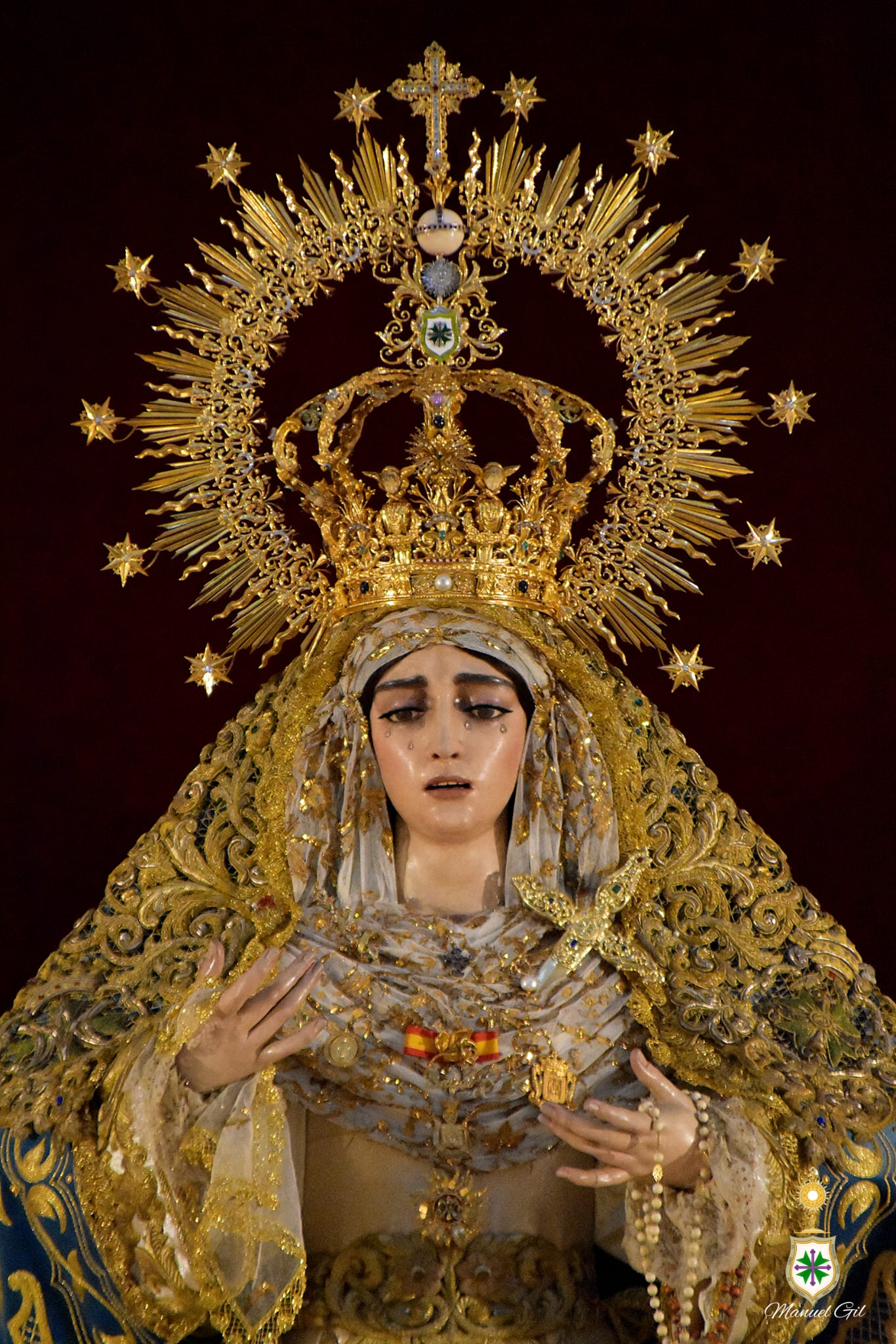La Santísima Virgen, revestida por Antonio Bejarano, luce la saya bordada en 1997 en el taller de Fernández y Enríquez con diseño de Manuel Guzmán Bejarano y el manto azul es el popularmente conocido como el de los canastitos, obra del bordador Jesús Rosado Borja en su taller astigitano con diseño de Francisco Javier Sánchez de los Reyes, estrenado en otoño de 2018. La toca de sobremanto es la de salida, obra de José Guillermo Carrasquilla en 1975 con diseño de Antonio Garduño Navas, entonces hermano mayor de nuestra corporación. Y sobre sus sienes, la Señora porta la presea labrada en plata por Fernando Marmolejo Camargo en 1967 y remozada y enriquecida en 2017 con oro y piedras preciosas por su hijo, Fernando Marmolejo Hernández, para la coronación canónica.
