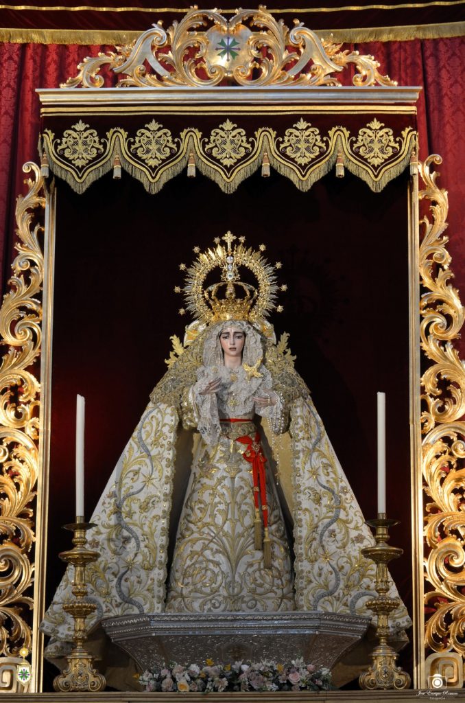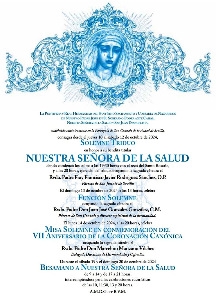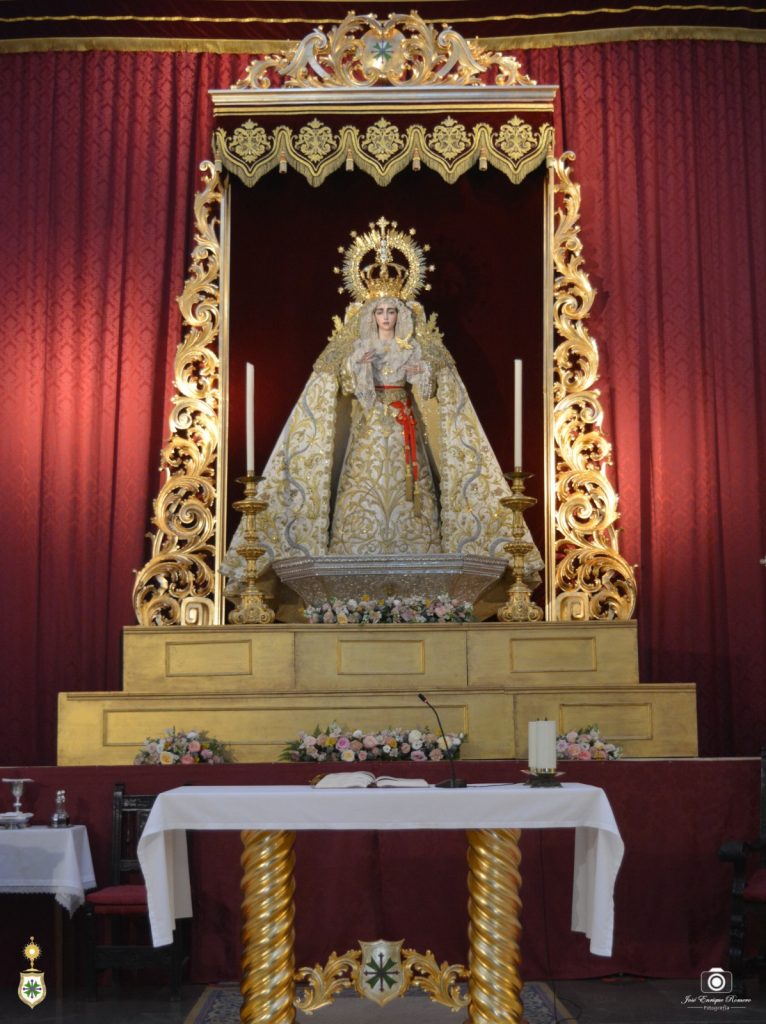 Este próximo jueves 10 de octubre dará comienzo el solemne triduo en honor a Nuestra Señora de la Salud, tras el cual precisamente, el lunes 14, se conmemorará el VII aniversario de la coronación canónica. Desde este lunes 7 por la noche, por cierto, nuestra amada titular preside el altar mayor de nuestra Parroquia de San Gonzalo, a la espera de que el equipo de priostía concluya en horas venideras el montaje del aparato de cultos con la candelería, la cera y el exorno floral.