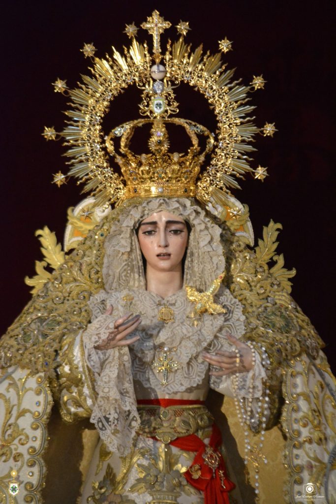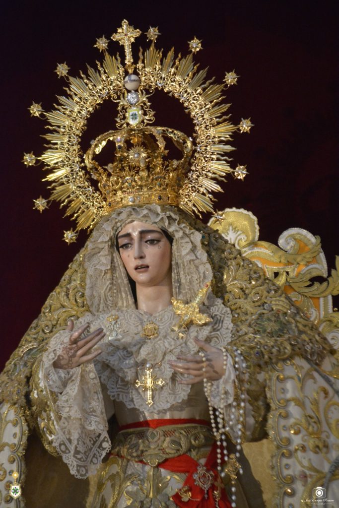 La Santísima Virgen, revestida por Antonio Bejarano Ruiz, luce la saya bordada en 1997 en el taller de Fernández y Enríquez con diseño de Manuel Guzmán Bejarano y el manto blanco que ostentó la Señora en el momento de su coronación canónica el sábado 14 de octubre de 2017, obra del bordador Luis Miguel Garduño Lara en su taller con diseño de Francisco Javier Sánchez de los Reyes, y que fuese donado por la cuadrilla de hermanos costaleros de su paso. La toca de sobremanto es la de salida, obra de José Guillermo Carrasquilla en 1975 con diseño de Antonio Garduño Navas, entonces hermano mayor de nuestra corporación. Y sobre sus sienes, la Señora porta la presea labrada en plata por Fernando Marmolejo Camargo en 1967 y remozada y enriquecida en 2017 con oro y piedras preciosas por su hijo, Fernando Marmolejo Hernández, para la coronación canónica. Entre otras piezas, luce la cruz pectoral donada en 2017 por la Hermandad de la Macarena, el escudo de oro de la Hermandad del Rosario de Mairena del Aljarafe, o la medalla de su coronación en oro donada por la familia Fernández Pizarro.