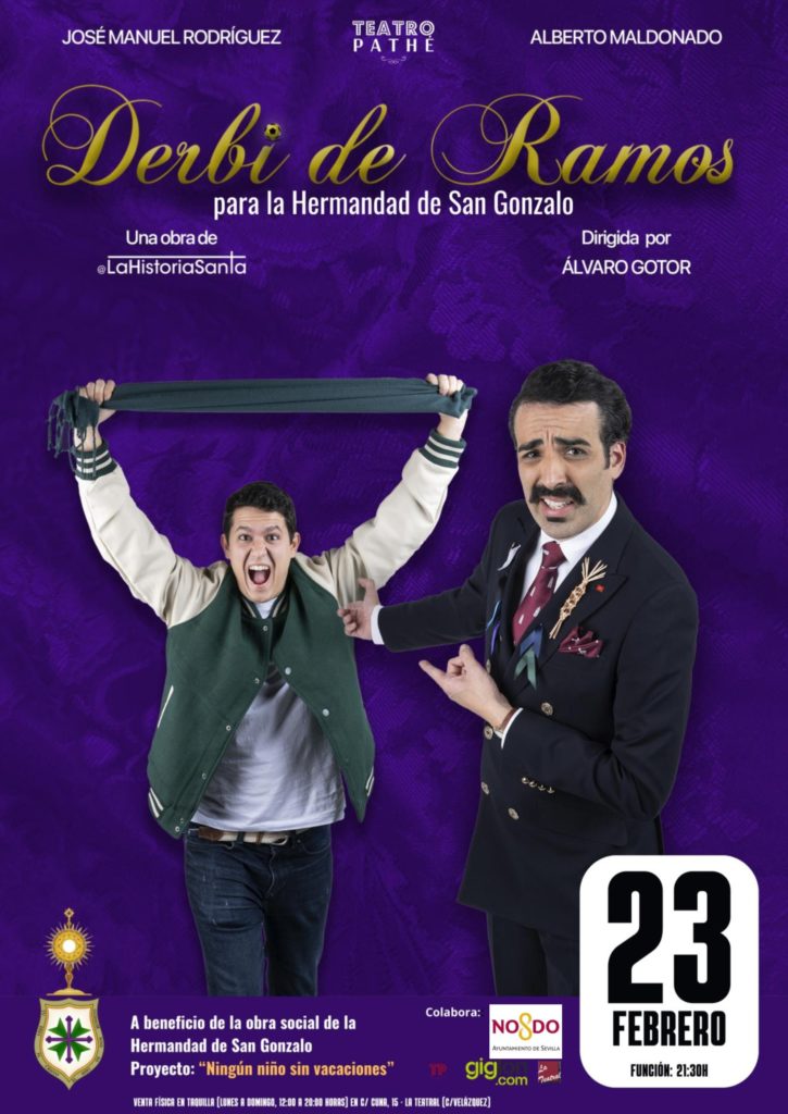 El próximo viernes 23 de febrero, a las 21:30 horas, «La Historia Santa» va a hacer una representación en el céntrico Teatro Pathé, en la calle Cuna, de su obra titulada «Derby de Ramos», cuya recaudación por la venta de entradas irá destinada a nuestra obra. Las localidades podrán adquirirse, mediante un donativo de 18 euros, tanto en las taquillas del propio teatro, como en la web Giglon (www.giglon.com/todos?idEvent=derbi-de-ramos-para-hermandad-de-san-gonzalo) y en la mayordomía de nuestra casa de hermandad.