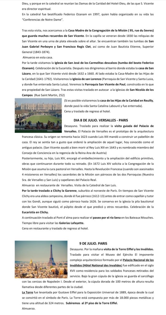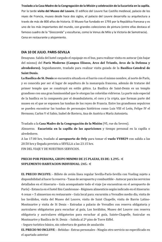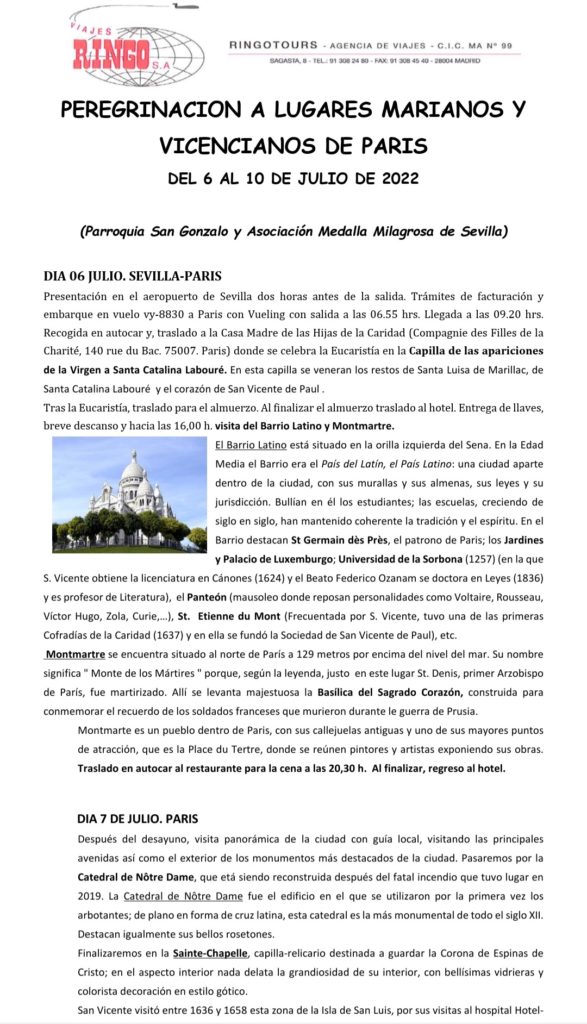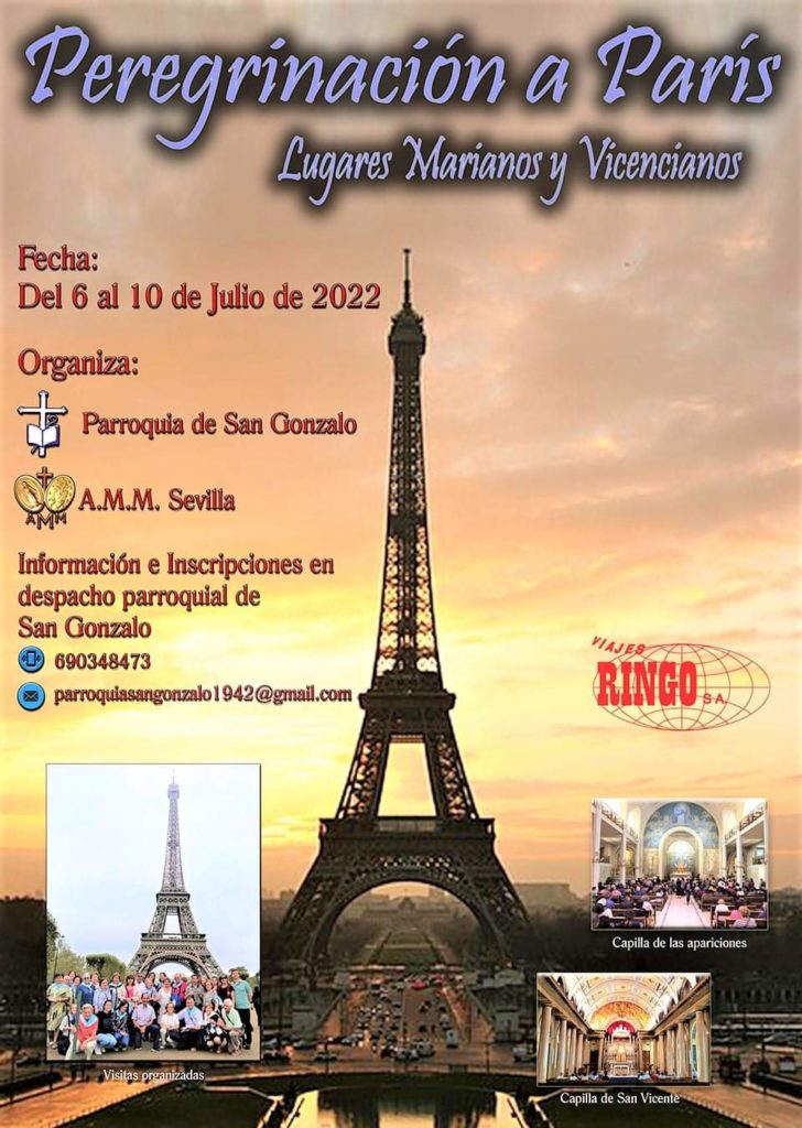 Nuestra Parroquia de San Gonzalo, junto a la Asociación de la Medalla Milagrosa, organiza para el próximo mes de julio una peregrinación a París para conocer y visitar los lugares marianos y vicencianos. Este viaje tendrá lugar concretamente desde el miércoles 6 al domingo 10 de julio, y habrá de contactarse con nuestro párroco y director espiritual, Juan José González González, bien por teléfono o bien por mail (los que se indican en el cartel) para inscribirse. A continuación mostramos toda la información sobre esta peregrinación a la que os animamos a participar como miembros de nuestra Hermandad de San Gonzalo.
