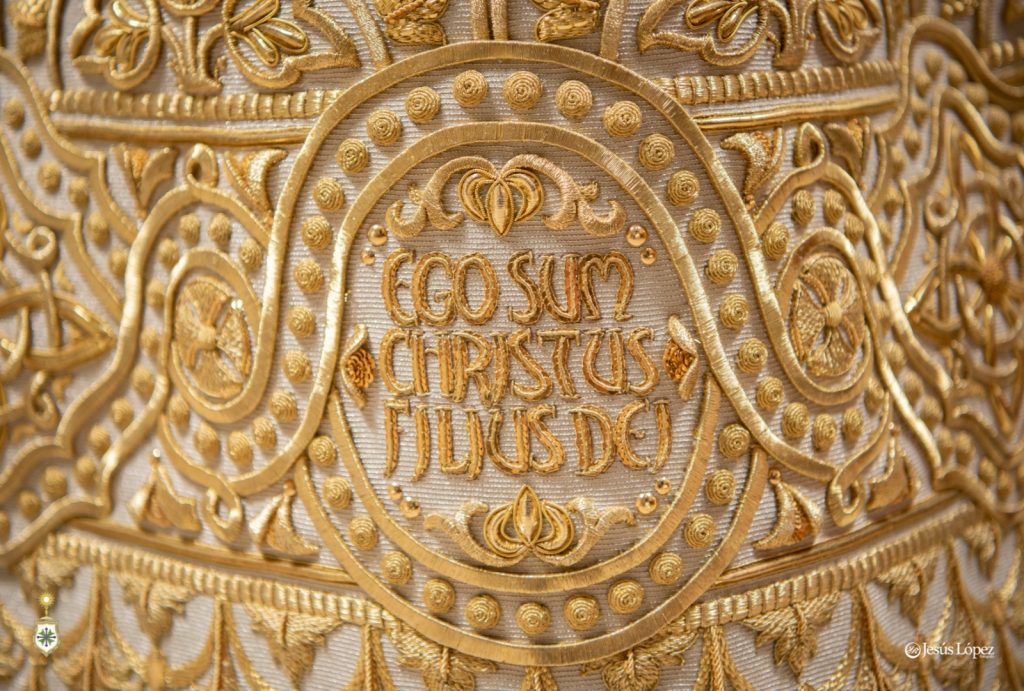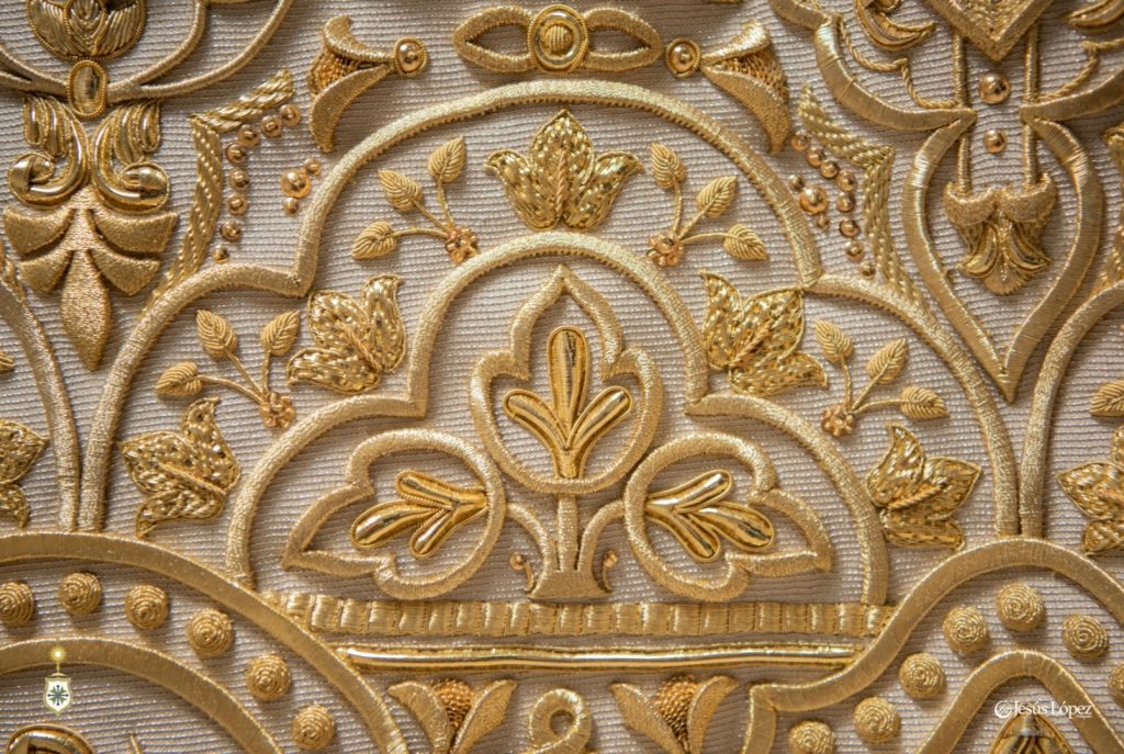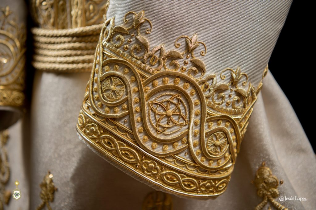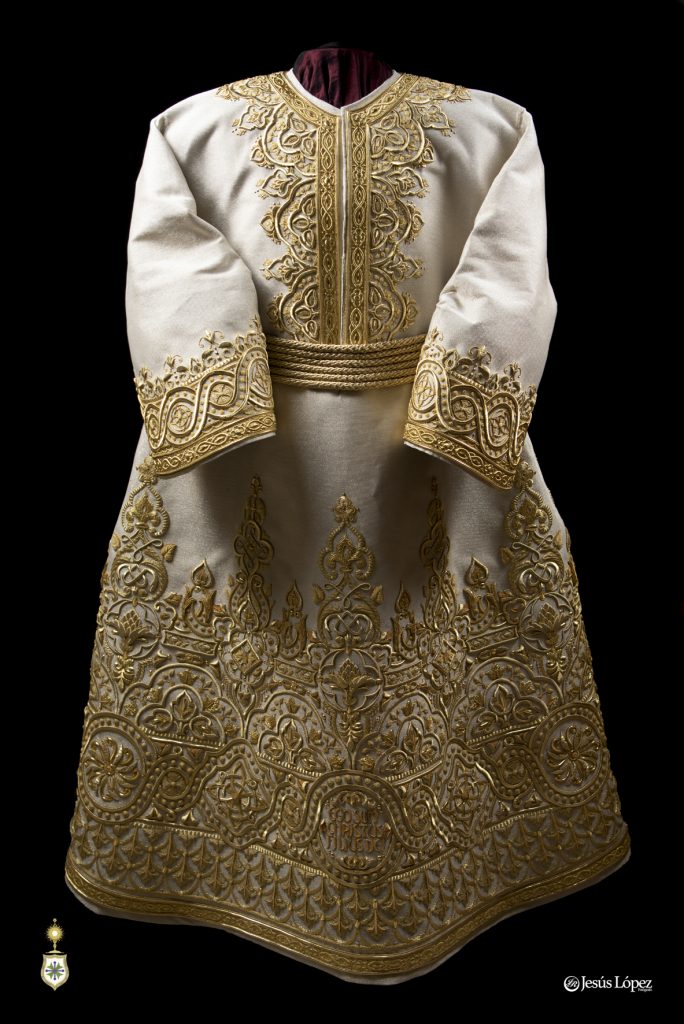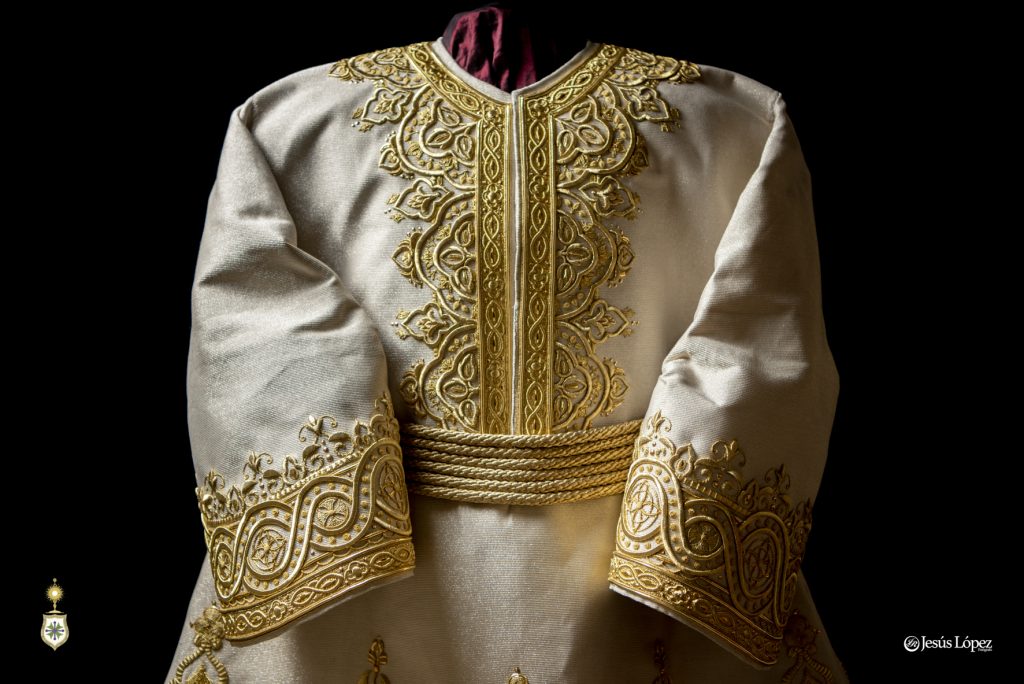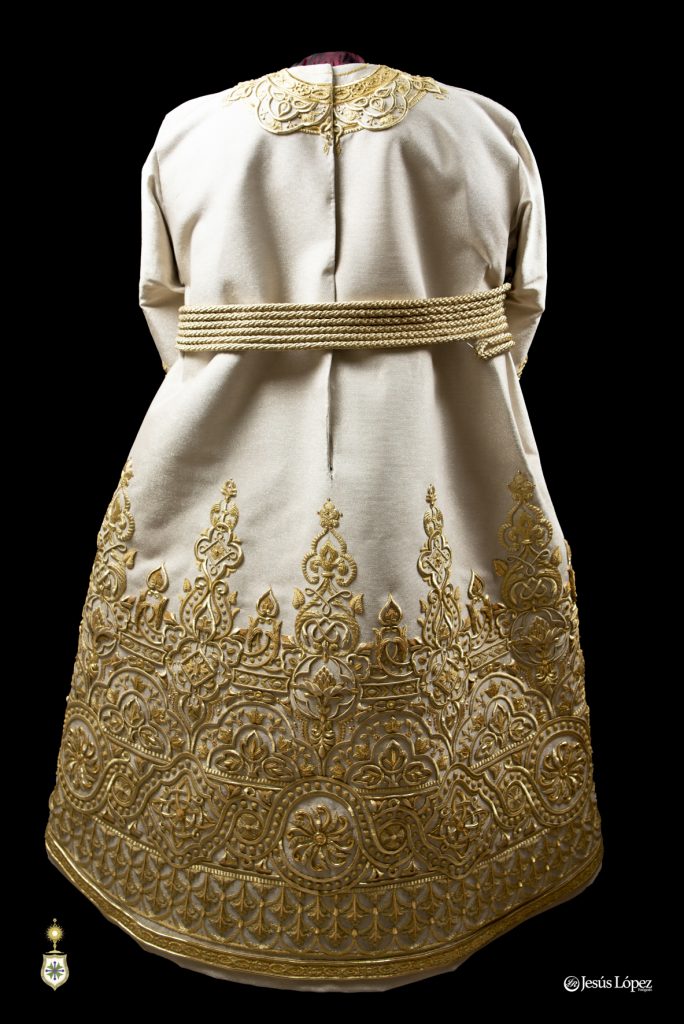 Esta túnica ha sido bordada casi en su totalidad a lo largo del año 2024 y principios de 2025, en pecho, dos mangas, espalda y falda tanto delantera como trasera, dejando libre el espacio para el cíngulo. Detallar que se han bordado las costuras laterales de la túnica, algo importante para que la túnica no quede de forma almendrada sino redondeada y al ponerla luzca mucho más. Ha sido bordada con un volumen discreto aunque por cercanía de éste taller de bordados al diseñador, éste ha seguido de cerca su ejecución asesorando al bordador ante las dudas que tuviera.