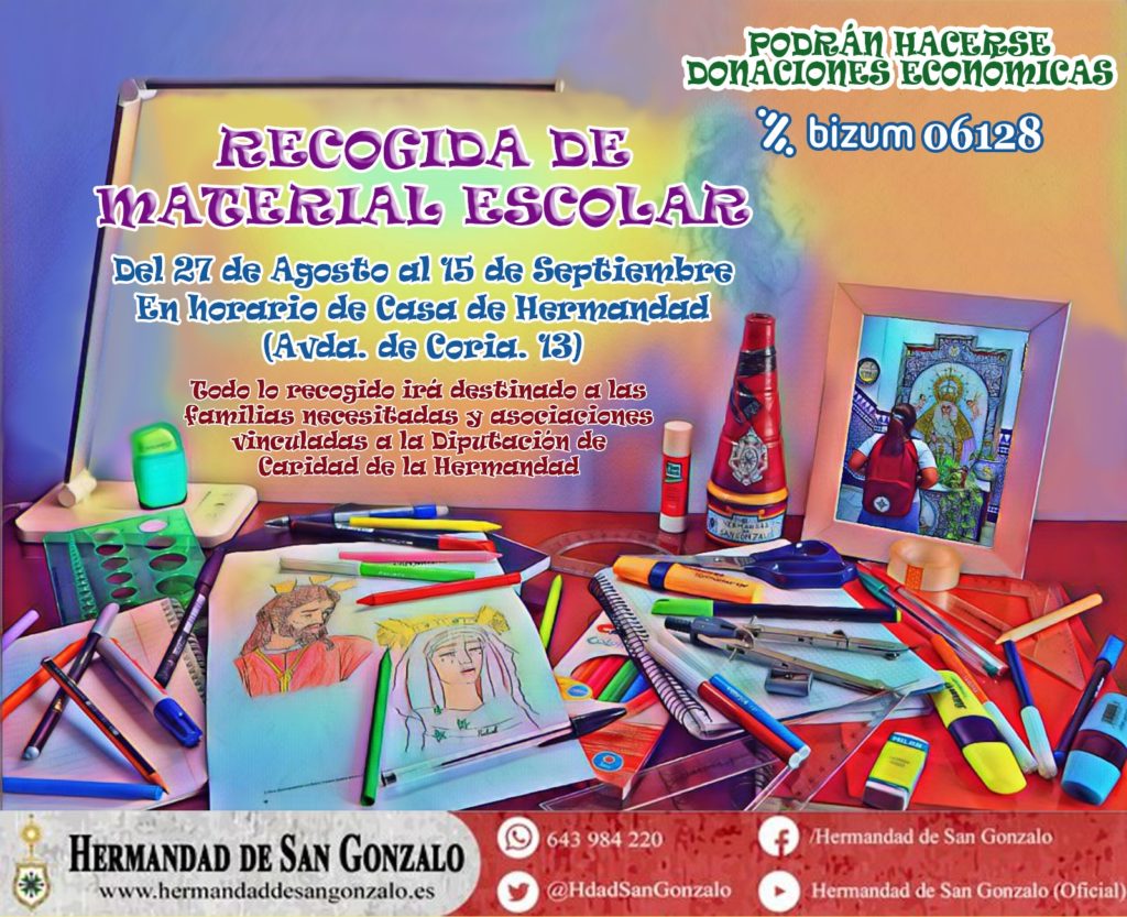El inicio del curso es una inversión muy importante en las economías familiares, por ello, desde nuestra hermandad siempre cumpliremos con uno de nuestros fines principales como es la caridad, por lo que, una vez más, pedimos vuestra colaboración, ya que esta labor es una tarea de todos los hermanos de San Gonzalo. Este año, como novedad, podrán realizarse donativos económicos a través de BIZUM al número 06128.