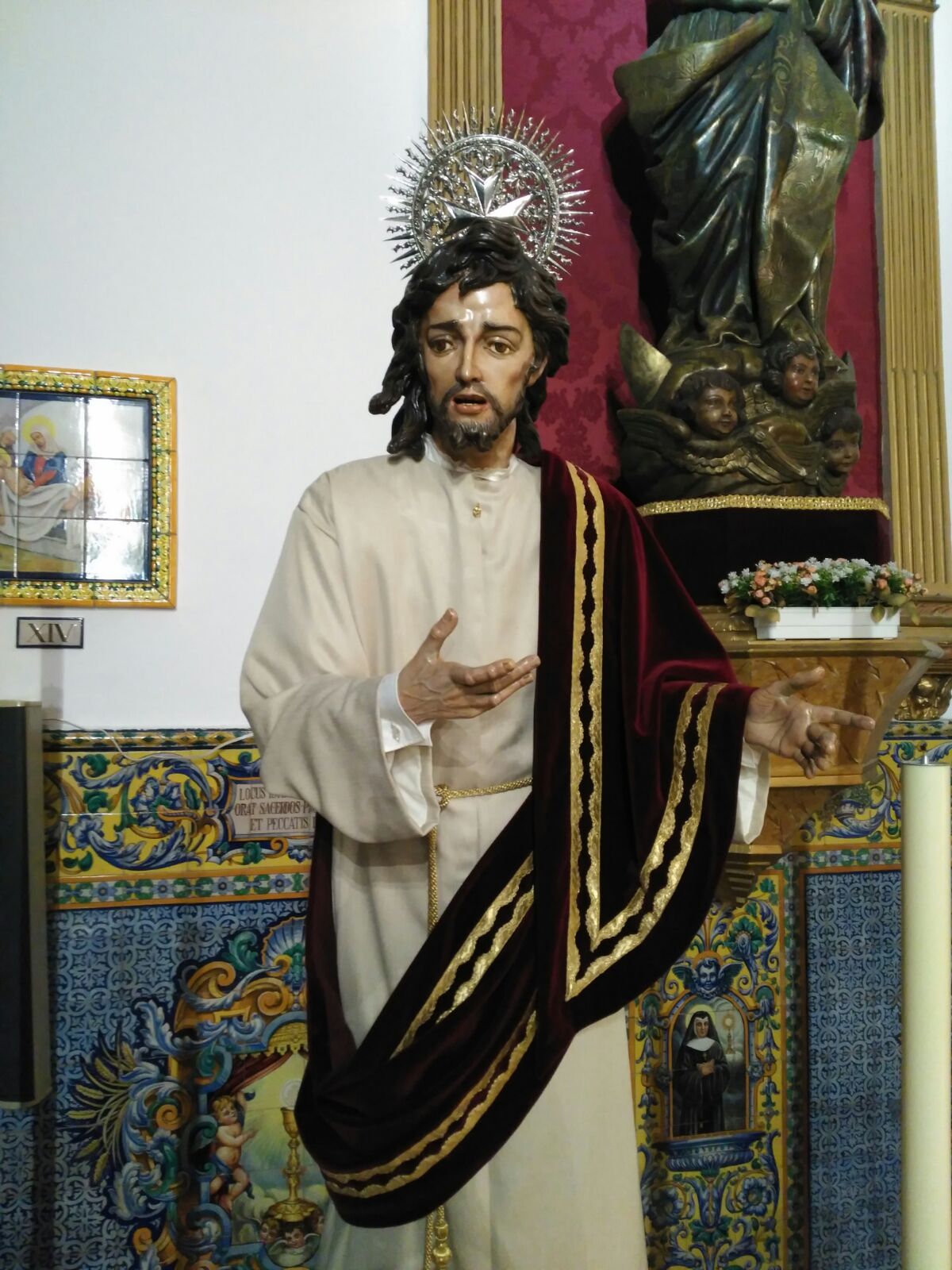 El 7 de julio de 1977, se daba cuenta en cabildo de oficiales que Luis Ortega Bru había regalado a la Hermandad la cabeza de un San Juan Evangelista, que sería acoplada al cuerpo del anterior titular cristífero de la cofradía, obra de Castillo Lastrucci, y por la que sólo se abonaría el coste de la madera. Esta imagen, titular también de San Gonzalo aunque no procesione, presenta un rostro joven, como corresponde a la tradicional iconografía de este evangelista, con un sentido de expresividad marcado pero mesurado para el estilo habitual de su autor.