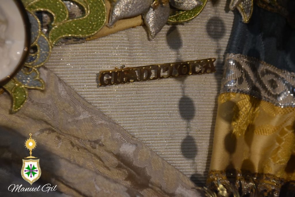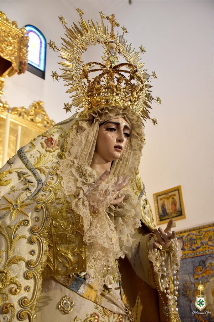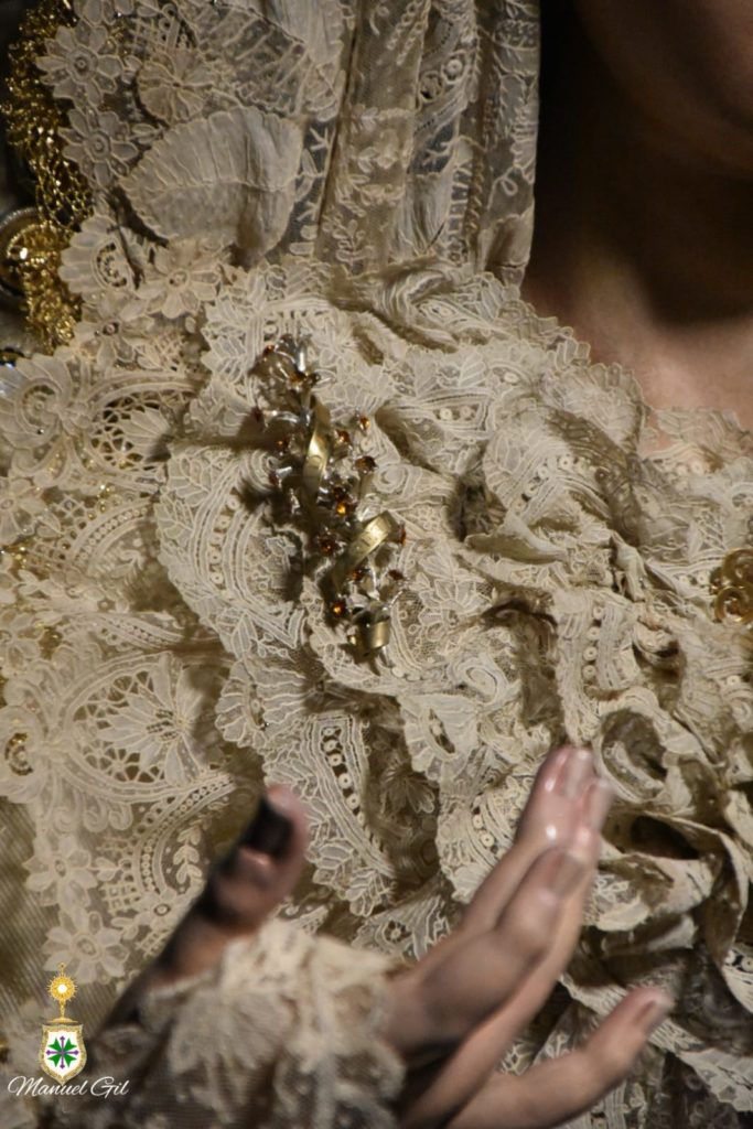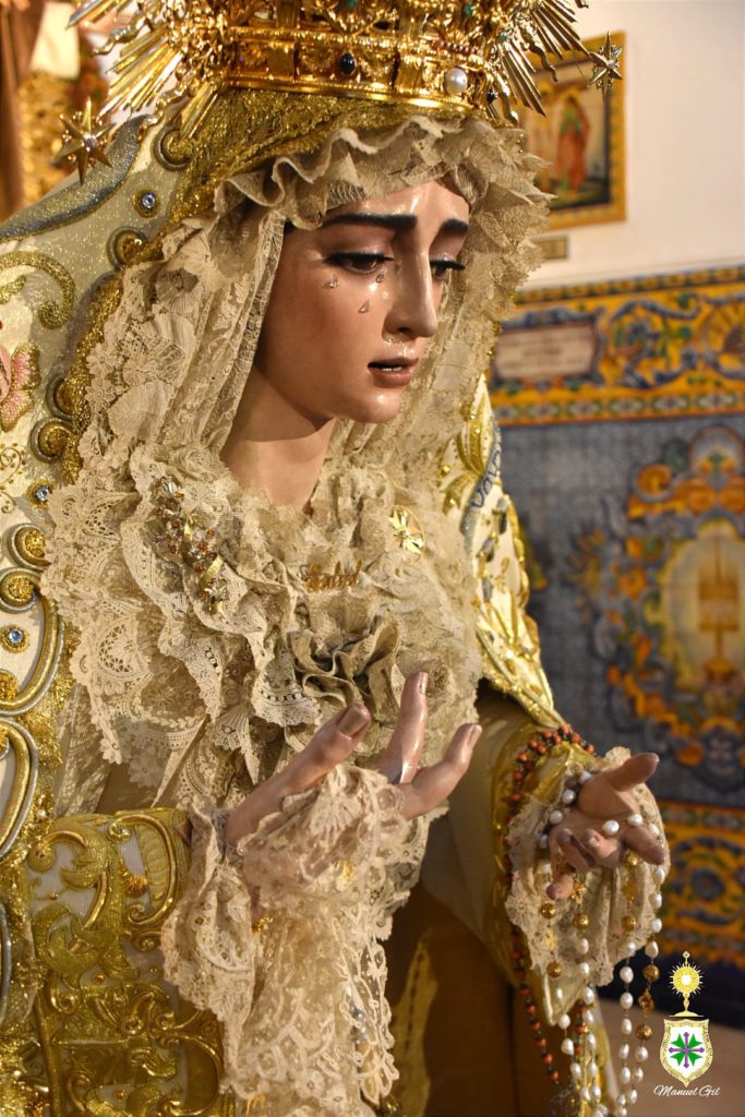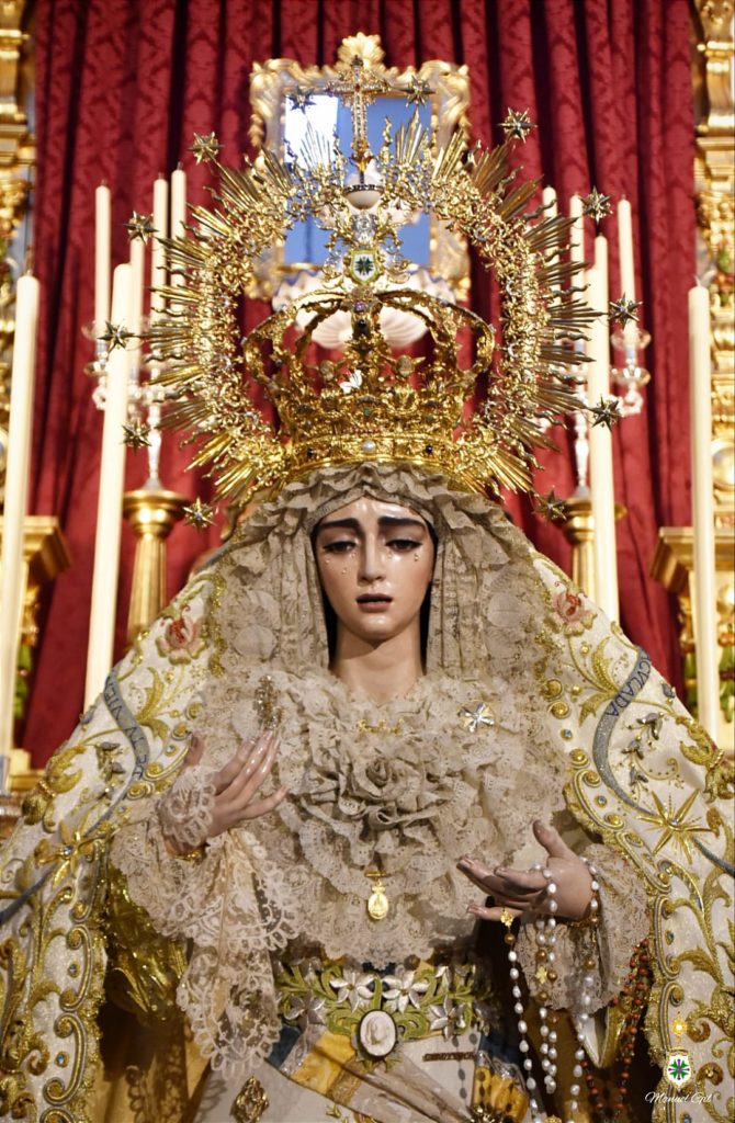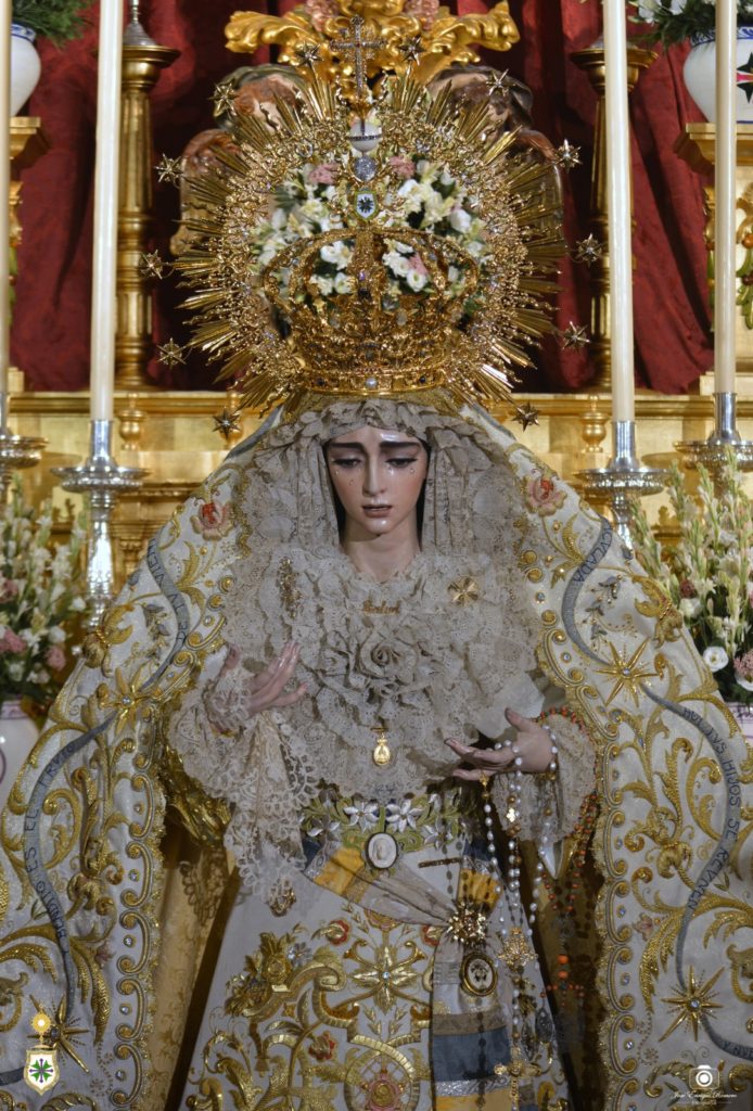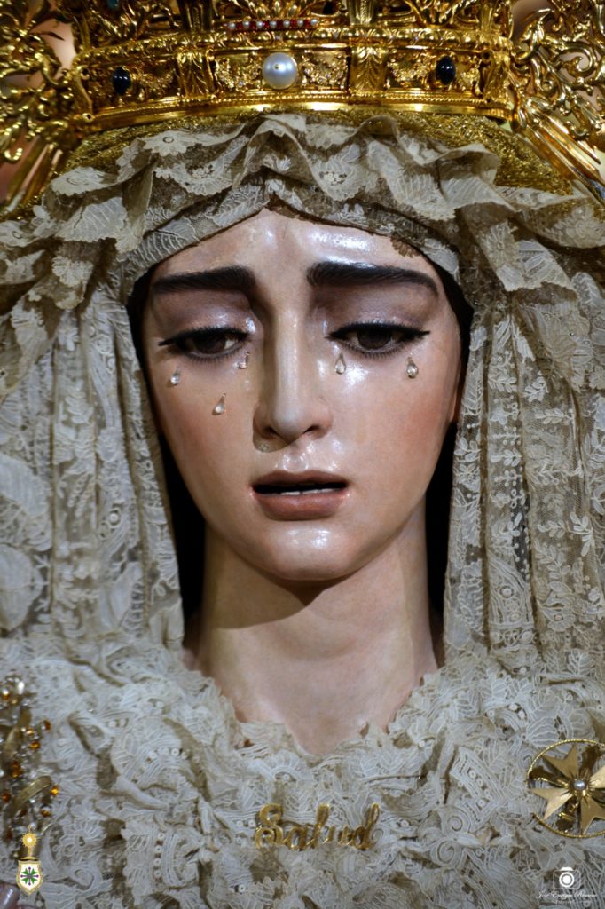 Nuestra Señora de la Salud se halla expuesta a la veneración de los fieles, como es costumbre desde hace ya poco más de tres lustros, en este último fin de semana de agosto. En esta ocasión, la imagen se ubica ante el retablo de nuestros titulares, luciendo sobre sus sienes la presea labrada por Fernando Marmolejo Camargo en 1967 y remozada y enriquecida por su hijo, Fernando Marmolejo Hernández, en 2017 con motivo de la coronación canónica; porta, además, la saya bordada por Jesús Rosado Borja y el manto realizado en el taller de Luis Miguel Garduño Lara, cuyos diseños corresponden a Francisco Javier Sánchez de los Reyes, estrenándose ambas prendas en la misa estacional de la coronación el sábado 14 de octubre de 2017. Entre otras piezas, la Virgen lleva el broche ofrendado por la Hermandad de la Divina Pastora de Triana, el camafeo de la Hermandad del Cachorro, la medalla de oro de la Asociación de la Virgen de los Reyes o la retama de plata de la Hermandad de la Hiniesta, presentes realizados durante los fastos de la coronación.