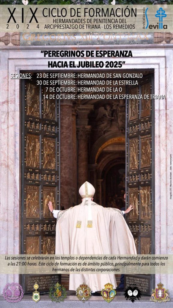 Las hermandades de penitencia del arciprestazgo de Triana-Los Remedios organizan, con el apoyo y asesoramiento de la delegación diocesana de hermandades y cofradías de Sevilla, el XIX Ciclo de Formación que tiene lugar cada otoño, centrándose en esta edición en el tema “Peregrinos de Esperanza, hacia el Jubileo 2025”.