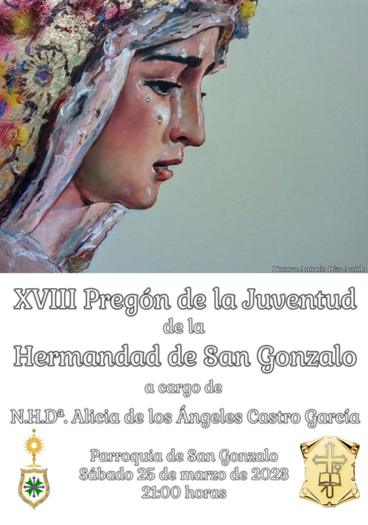 El próximo sábado 25 de marzo, a las 21:00 horas, tendrá lugar en nuestra Parroquia de San Gonzalo el XVIII Pregón de la Juventud de nuestra hermandad, que correrá a cargo de nuestra hermana Alicia de los Ángeles Castro García, quien será presentada por nuestro hermano Pablo Sánchez Arias.
